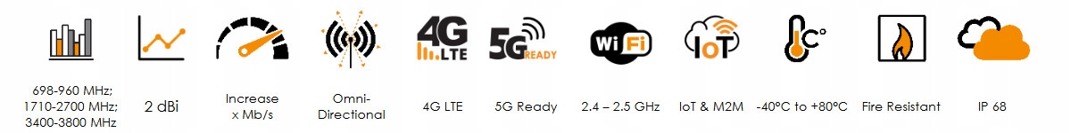 Новая антенна OMNI-297 является частью нашей новой серии антенн Rhyno. OMNI-297 — широкополосная сотовая антенна, работающая в диапазоне от 698 до 3800 МГц, охватывающая все современные диапазоны частот 5G и LTE. Антенна разработана для превосходного контроля диаграммы направленности во всем диапазоне частот, что делает OMNI-297 исключительной всенаправленной антенной, учитывая ее размер. Постоянное усиление во всем диапазоне частот улучшает такие функции LTE, как агрегирование нескольких несущих (CA). Идеальная работа для стационарных инсталляций любых сотовых диапазонов. Он также идеально подходит для межмашинных (M2M) и интернет-приложений (IoT), которые обмениваются данными через сети GSM (GPRS/EDGE/3G/HSPA/LTE).