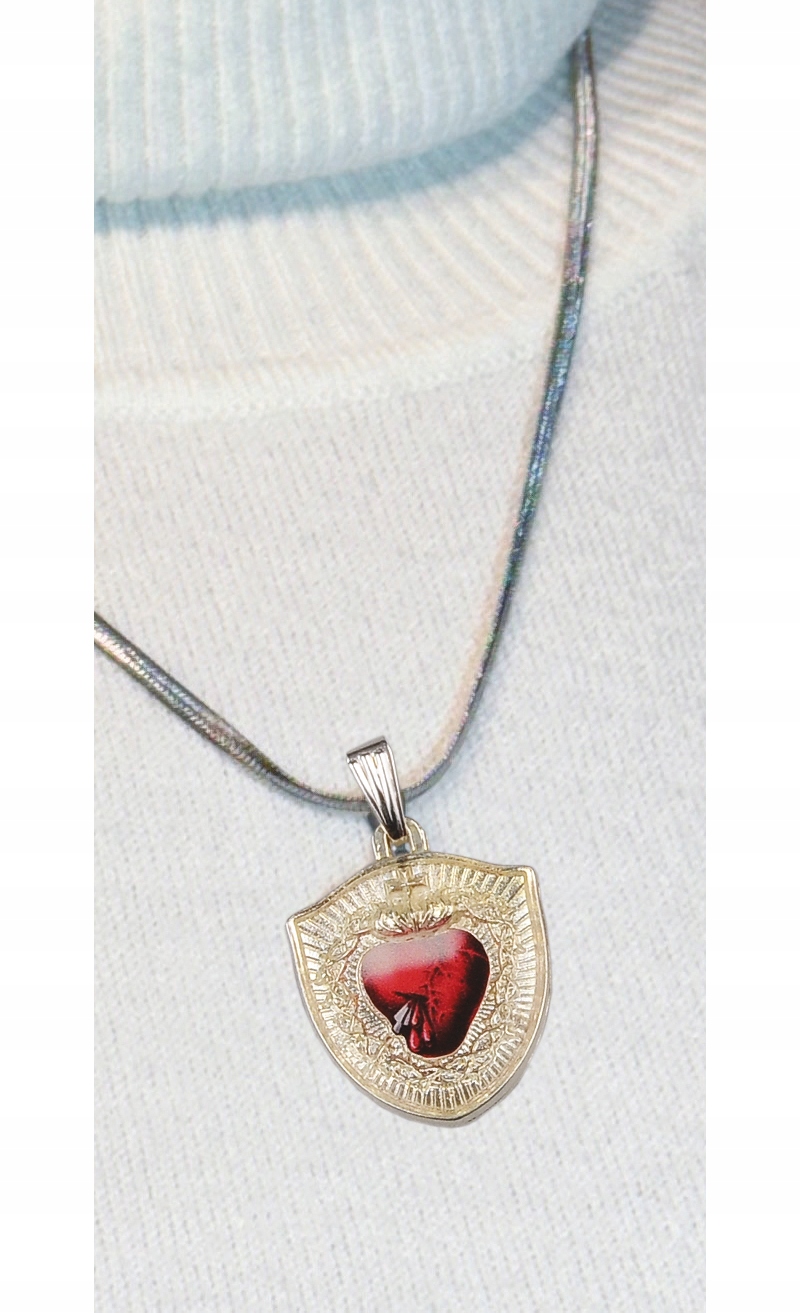 Двух -серебряная медаль Священного Сердца Иисуса. Сделанный исходной техникой, аверс, покрытый дополнительным устойчивым из УФ -излучения. Малорзата Мария Алакоке более 300 лет назад. Господь Иисус пообещал Малорзату 12 Особые услуги для тех, кто будет поклоняться священному сердцу, и внешнее выражение этой чести - щит NSPJ, созданный в соответствии с видением святого. Несколько десятков лет спустя, когда во Франции бушевала чума, еще один визит в культ Священного Сердца, появился Иисус, который обещал особую защиту во время поклонников священного сердца. Затем к щиту добавили надпись: «Стоей, Сердце Иисуса со мной». Расширяющийся культ священного сердца означал, что церковь дважды давала снисходительность носить щит, и многочисленные свидетельства указывают на то, что поклонники священного сердца Иисуса, которые носили щит с верой, испытывали мощную защиту от болезней, чумы и других опасностей.