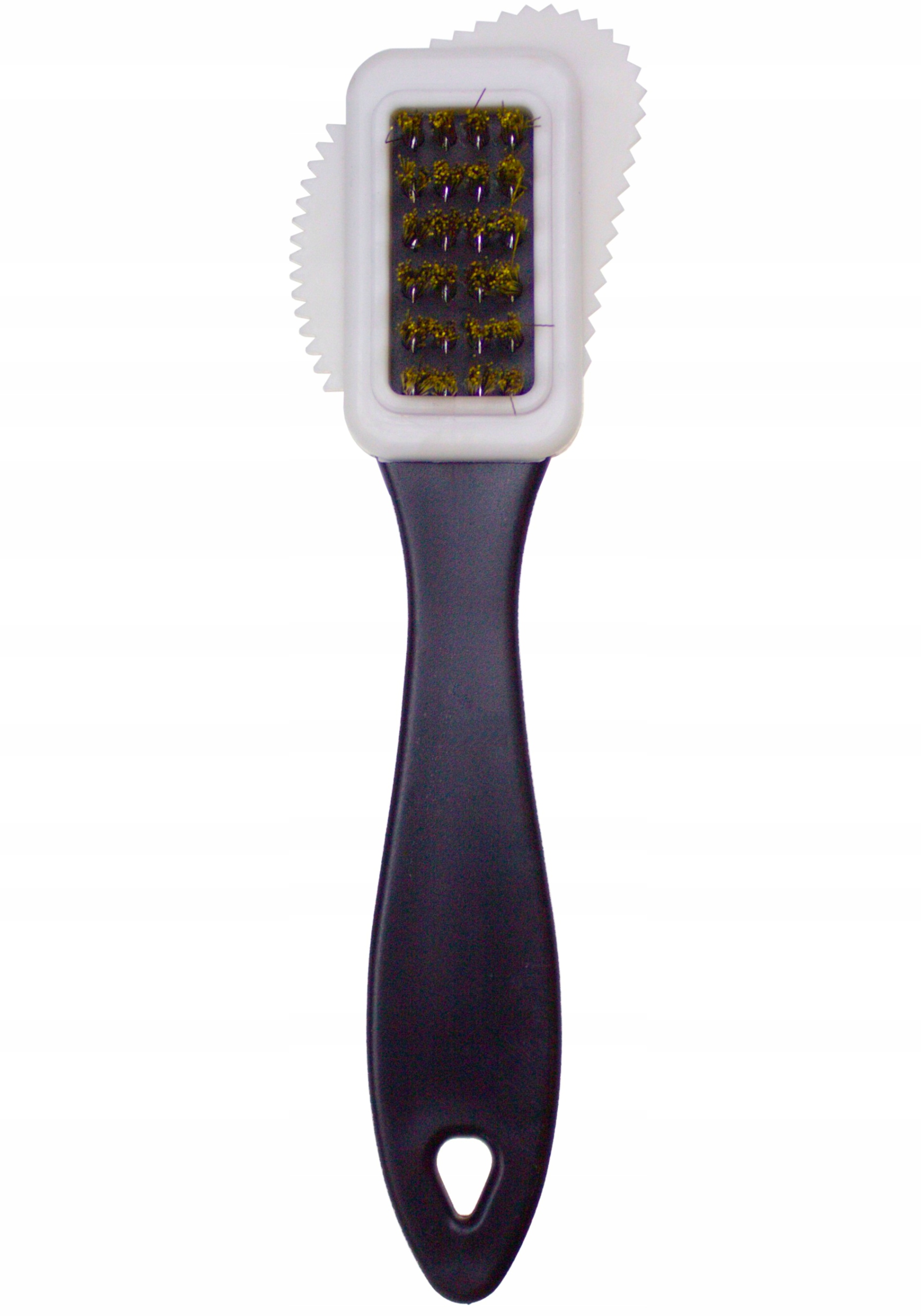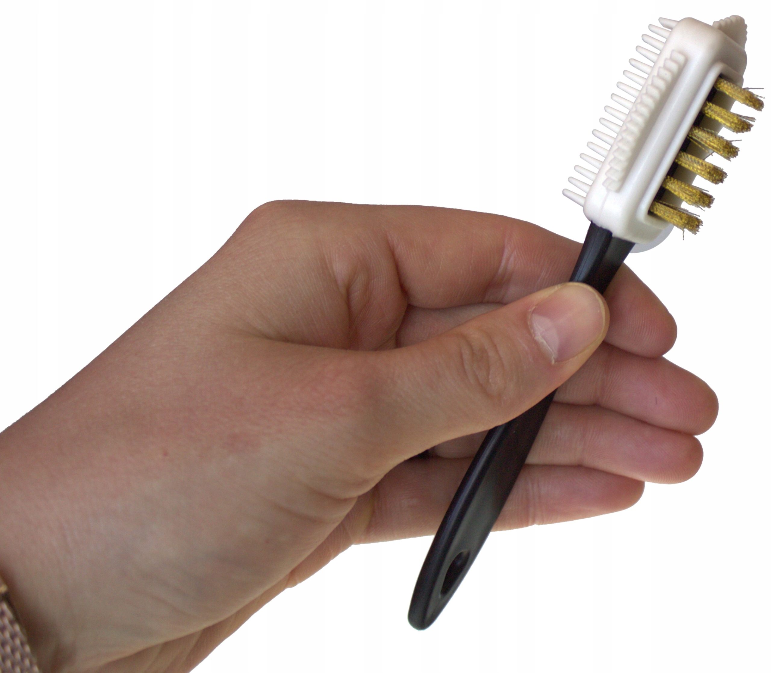 - Двусторонняя щетка для чистки обуви из велюра и нубука. Щетина из латунной проволоки предназначена для замши и резины, нейлоновая – для нубука.