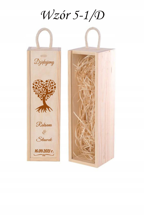 Деревянный ящик для вина, изготовленный польским производителем с вниманием к деталям. Элегантная шкатулка с индивидуальной свадебной гравировкой. Классическую деревянную шкатулку можно подарить жениху и невесте в качестве подарка на свадьбу или юбилей, в качестве благодарственного подарка родителям или подарка лучшему мужчине. В коробку добавляем наполнитель в виде натуральной древесной шерсти. Ручка изготовлена из толстой и прочной веревки. Простая форма дополнена гравировкой, которая (в зависимости от дизайна) содержит графические элементы, имена, инициалы или дату. В ящике можно разместить одну бутылку алкоголя или другой предмет аналогичного размера.