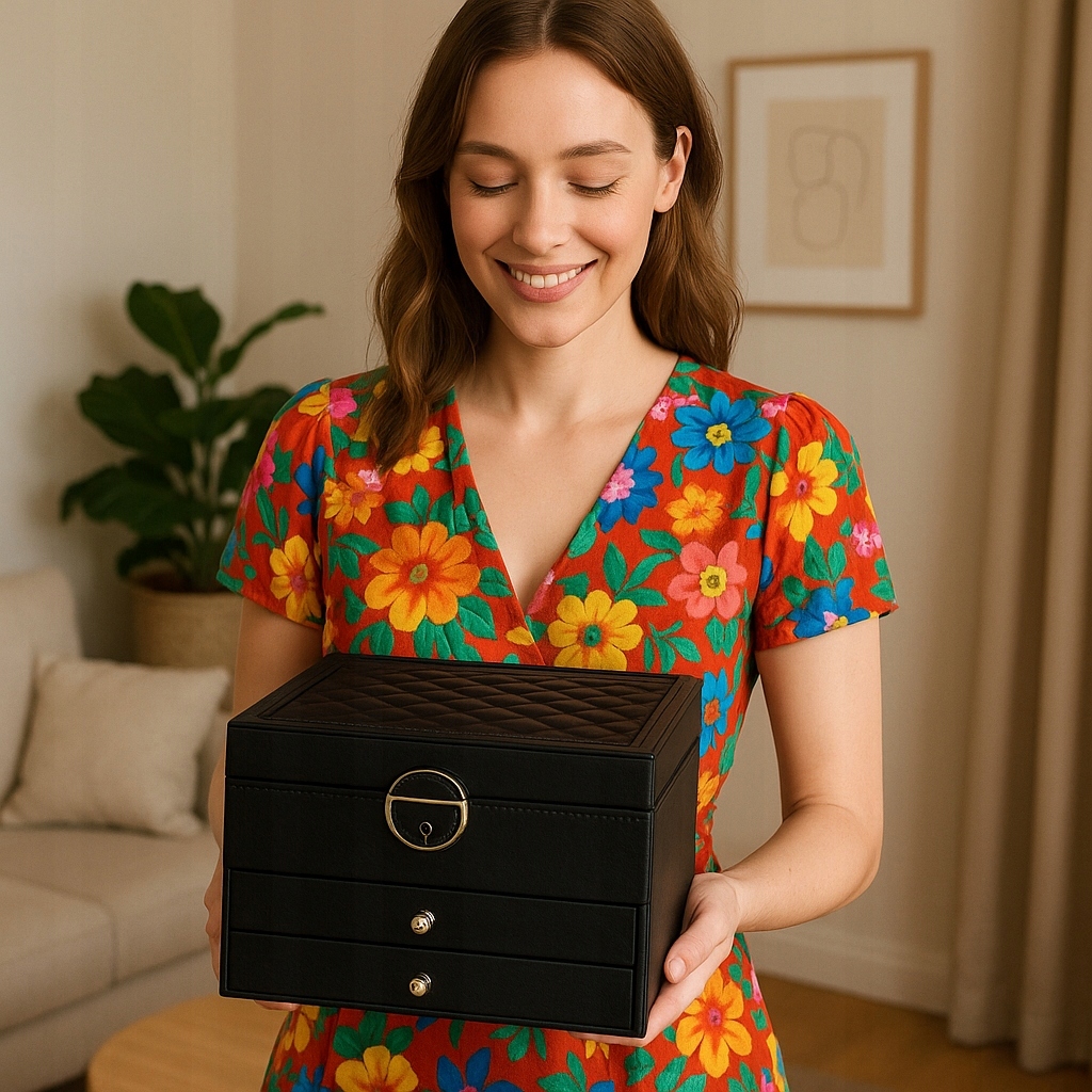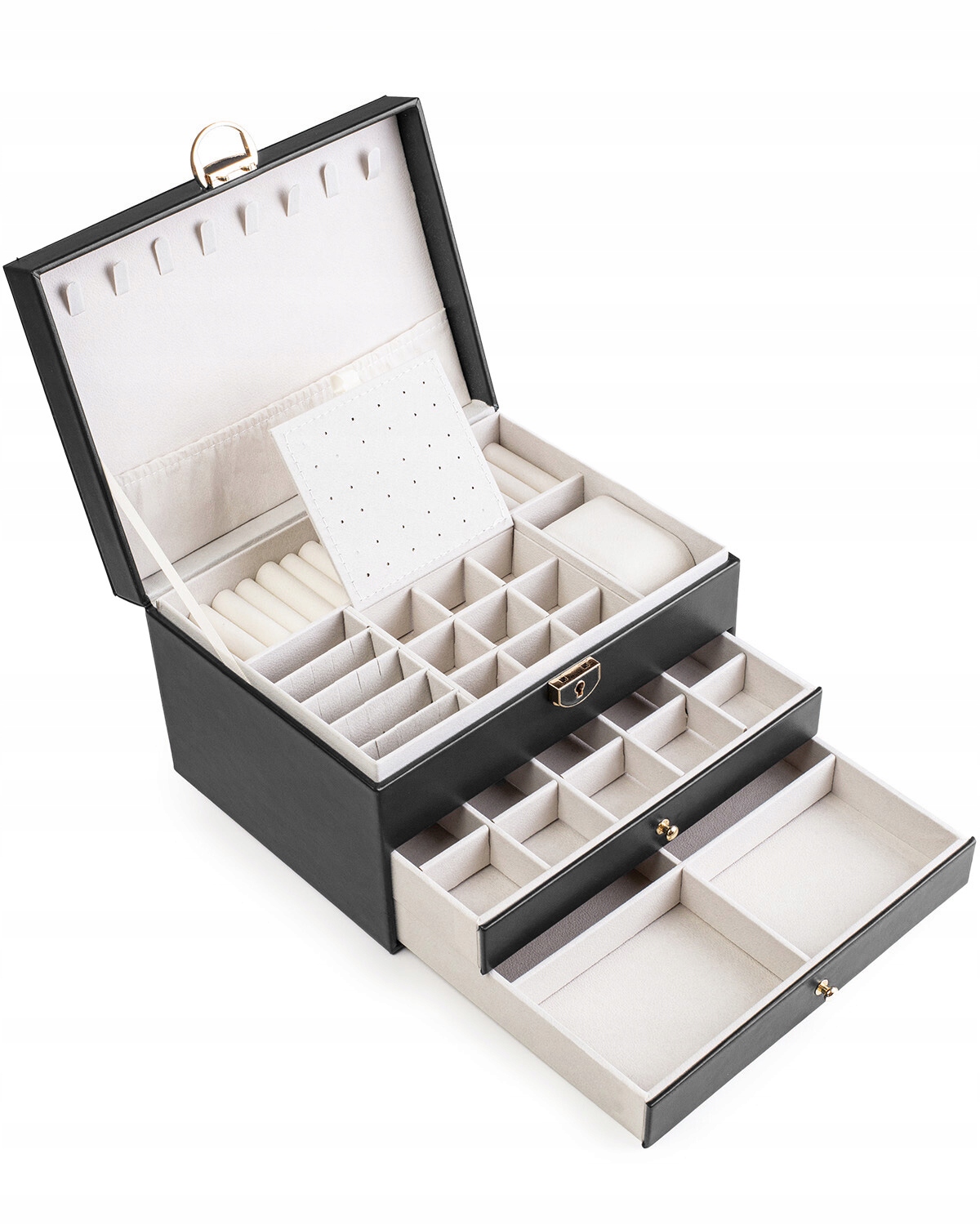 ta Компактная ювелирная шкатулка в элегантном черном цвете является вдумчивым решением для каждого любителя стильных аксессуаров. Его интерьер был спроектирован с вниманием к функциональности и комфортом ежедневного использования - будет размещать как небольшие, так и более крупные украшения.