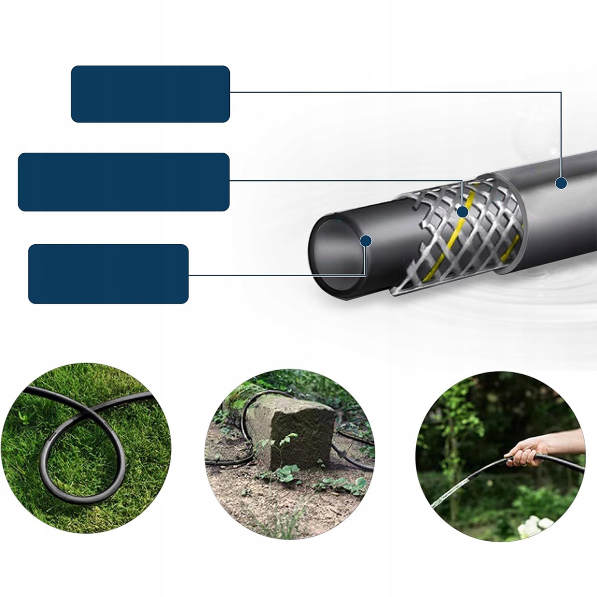 【Высококачественные материалы】 1. Верхний слой изготовлен из износа -резистентного полиуретана, который устойчив к нефти, погодных условиям, озону и истиранию. 2. Усилующий слой стальной проволоки представляет собой прочную текстильную сетку из стальной проволоки, сдерживаемое высоким давлением. 3. Полиэфирский арматурный слой изготовлен из высокопрочной полиэфирной ткани. 4. Внутренняя трубка изготовлена из термопластичного полиэстера.