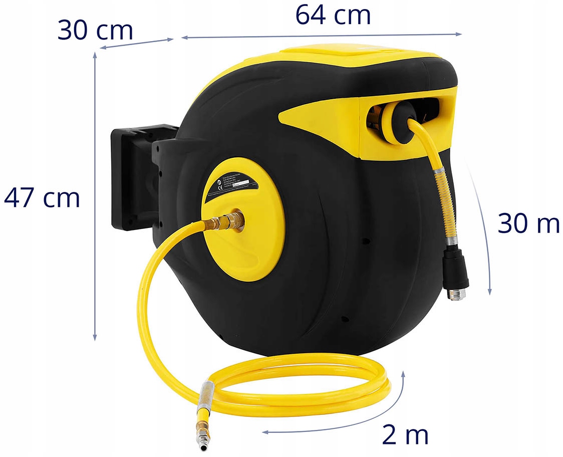 Держатель катушки для пневматического шланга можно легко закрепить как на потолке, так и на стене. Необходимые аксессуары для установки входят в комплект поставки. Втягивающее устройство также повышает безопасность труда. Шланг компрессора длиной 30 + 2 м надежно хранится в закрытом пластиковом (ПП) корпусе, защищающем его от износа.