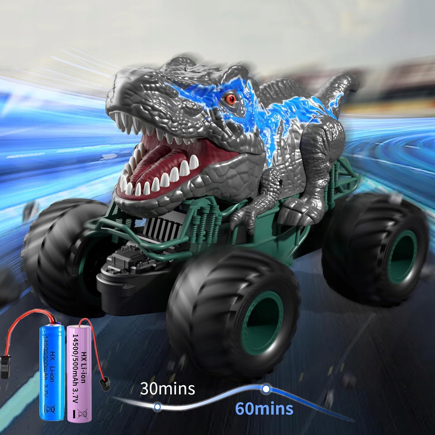 Благодаря двум перезаряжаемым батареям большой емкости с дистанционным управлением этот автомобиль, оформленный в стиле динозавров, позволяет ездить до 60 минут. удовольствие от вождения (30 минут на аккумулятор). Обеспечивает гибкие возможности зарядки через USB, совместимые с компьютерами, мобильными источниками питания и традиционными розетками (время зарядки около 3 часов). Для пульта дистанционного управления требуются 2 батарейки типа АА 1,5 В (не входят в комплект).