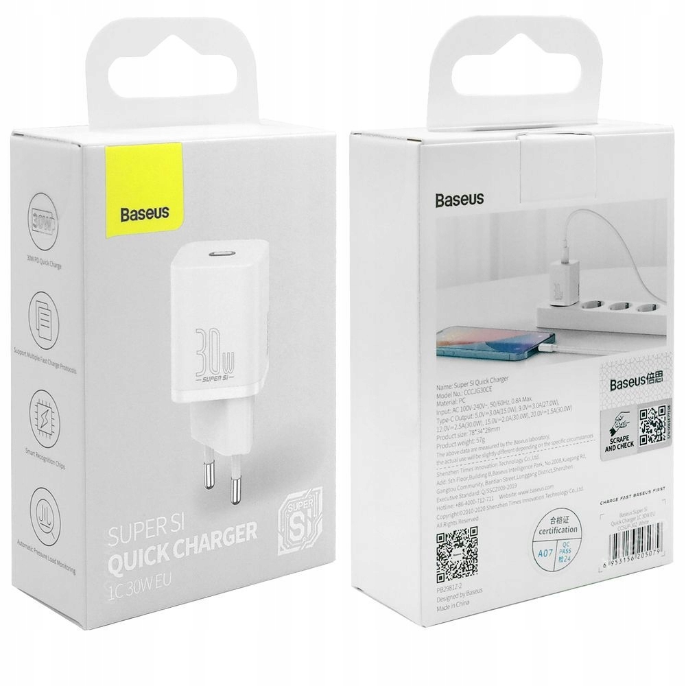 Сетевое зарядное устройство Baseus с портом USB-C обеспечивает быструю зарядку мощностью 30 Вт, что идеально подходит для новейших смартфонов.