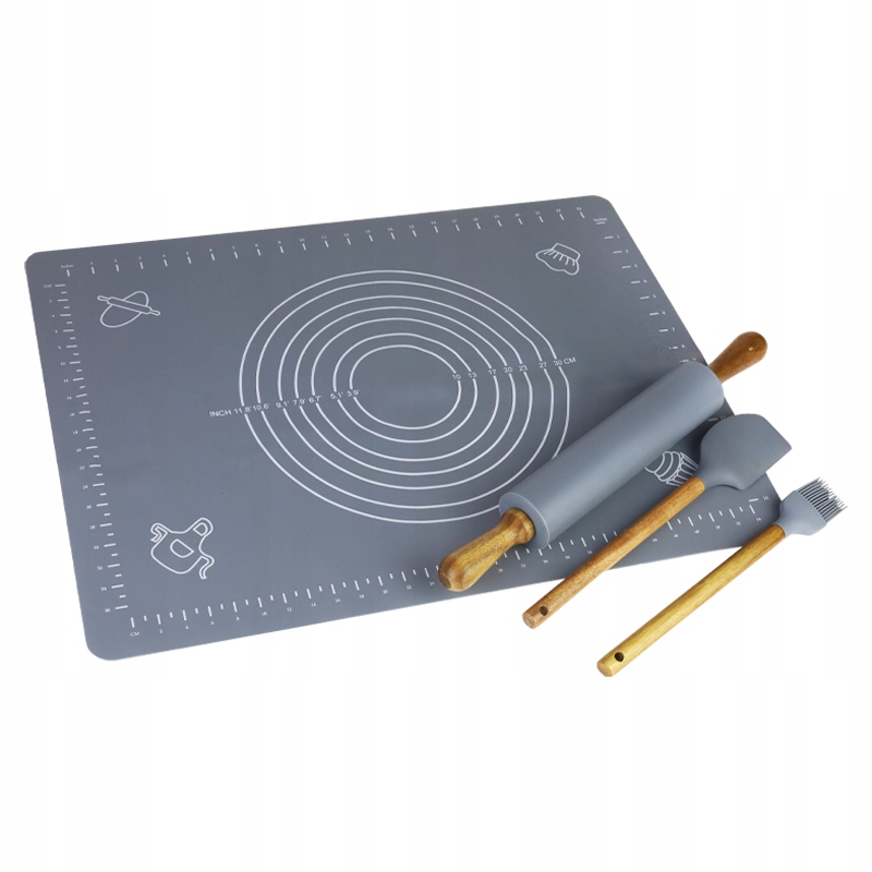 Комплект изготовлен из высококачественного серого силикона, выдерживающего температуру от -40 до 230 градусов Цельсия. При формировании теста коврик не будет двигаться, а благодаря нанесенным на доске делениям можно точно раскатать каждый кусок теста до определенного размера (сантиметровые боковые деления и круги диаметром от 10 до 30 см). .