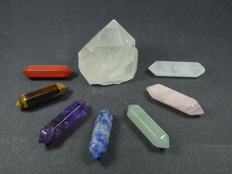 В набор двусторонних минералов входят горный хрусталь, красная яшма, тигровый глаз, розовый кварц, авантюрин, содалит и аметист.