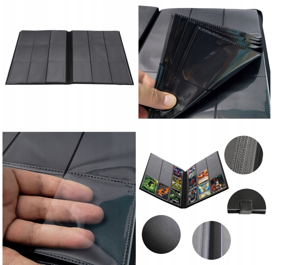 - Страницы с 9+9 карманами, загруженными на стороне, предотвращает легкое падение карт