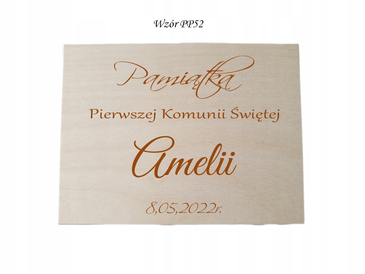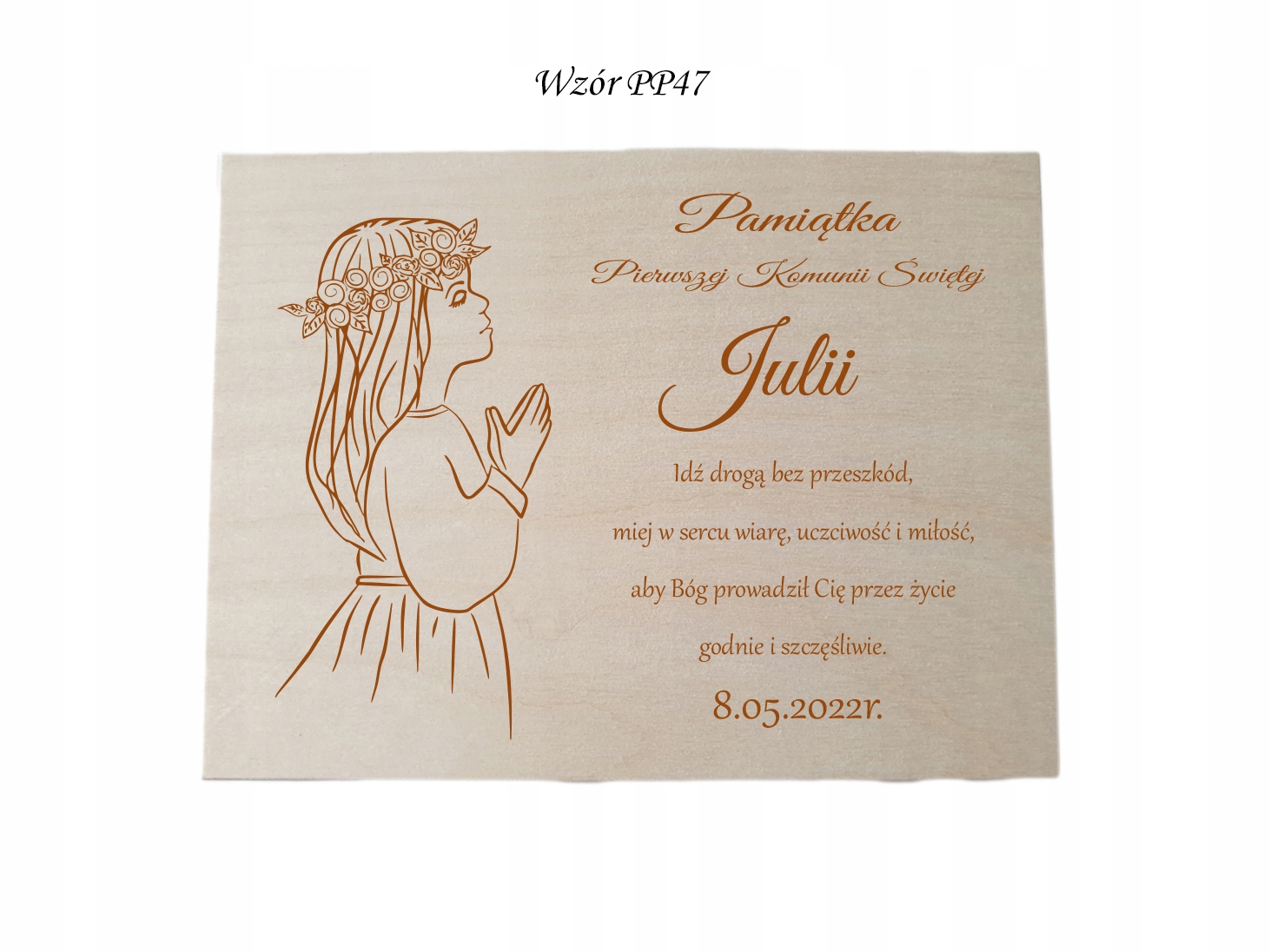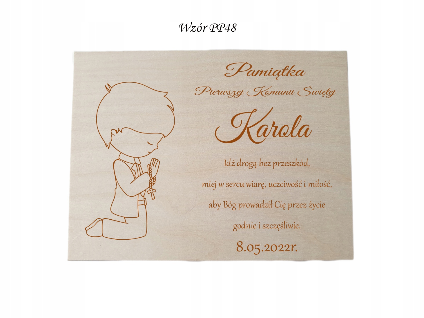 Копилка – прекрасный подарок, который можно подарить ребенку и его родителям по случаю Первого Причастия. Деревянная закрытая открытка – это оригинальная форма пожеланий и прекрасный сувенир на будущее. Кейс закрывается на магнит, чтобы содержимое не высыпалось. Удобная и сделанная со вкусом коробочка идеально подойдет для выражения пожеланий в день церемонии. Простая форма дополнена персонализированной гравировкой на крышке и пожеланиями внутри коробки. Коробку можно наполнить купюрами или другим небольшим подарком, например, медальоном, изображением святого, ангела.