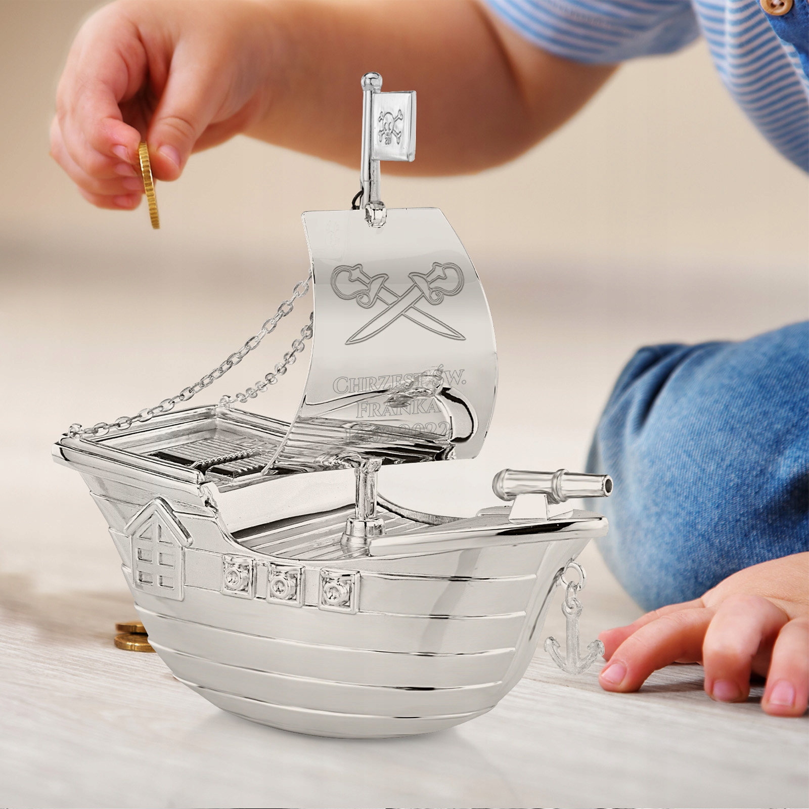 Копилка в виде пиратского корабля – отличный подарок на многие случаи жизни. Необычайно нарядный внешний вид копилки делает ее чрезвычайно привлекательной для самых маленьких! Он обязательно станет сувениром к особым событиям в жизни ребенка, например, День рождения или Святое Крещение. Он изготовлен из высококачественного материала, все изделие посеребрено и покрыто глянцевым лаком. Внизу имеется заглушка для извлечения денег.