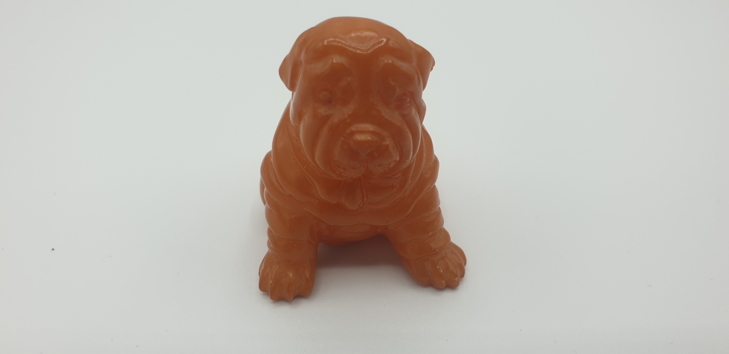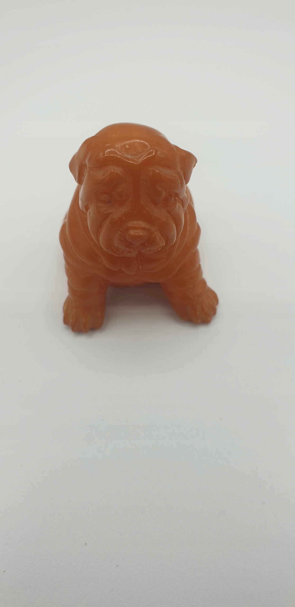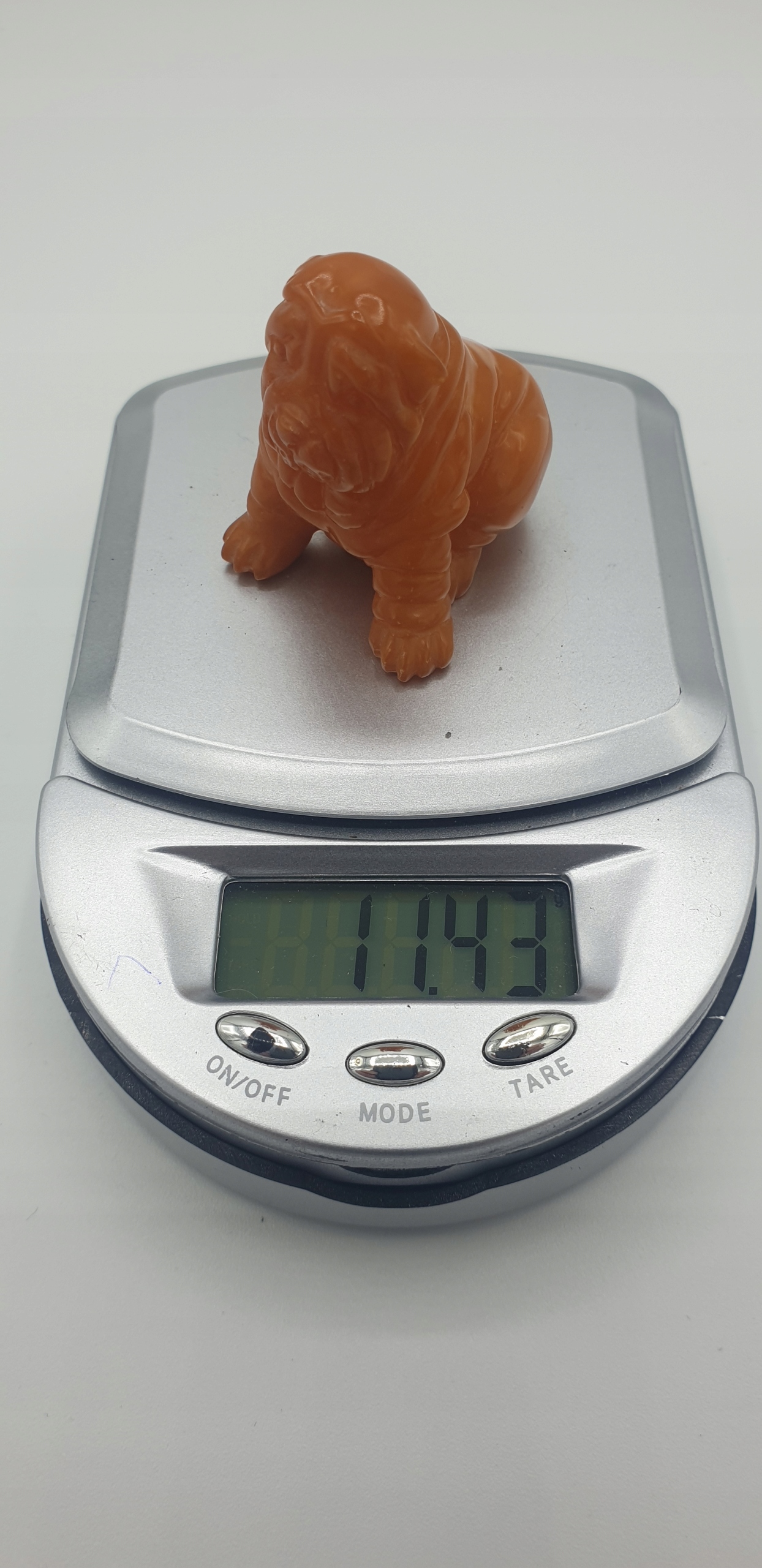Скульптура собаки мопса, изготовленная вручную из одного куска балтийского янтаря уникального медового цвета.