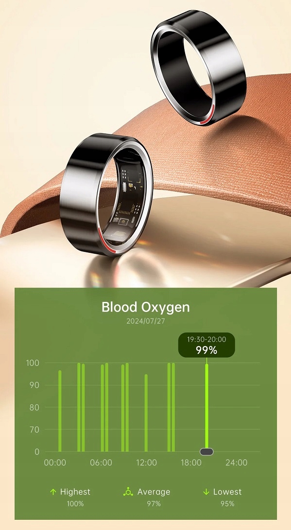 Kumi Ring H1 позволяет вам контролировать уровень насыщения крови кислородом, что позволяет быстро обнаружить любые проблемы, такие как гипоксия. Кольцо работает как портативный помощник здравоохранения, предоставляя информацию о уровне кислорода в крови на постоянной основе, что помогает поддерживать здоровье и безопасность. Благодаря этой функции пользователь постоянно контролирует свое здоровье в любом месте и времени.