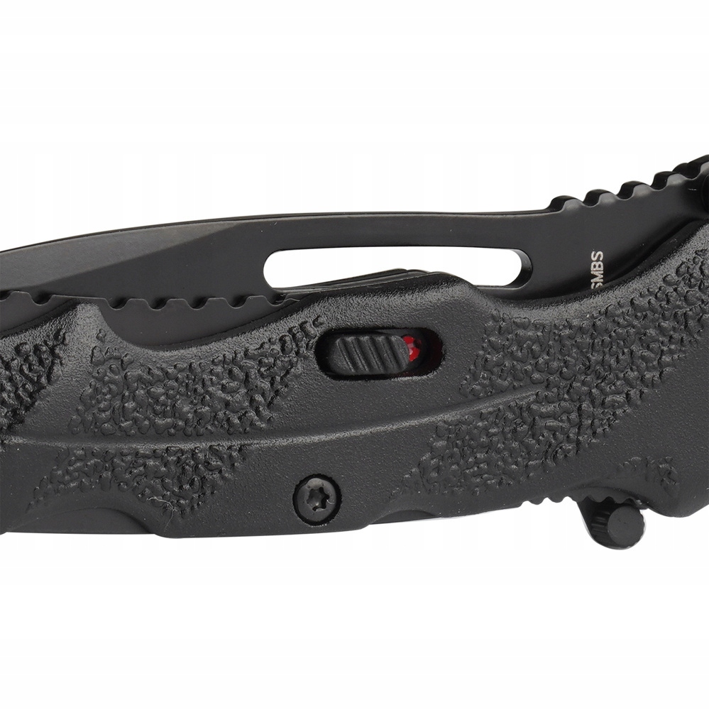 Очень легкий нож со складным лезвием и пружиной. Клинок точки сброса, изготовленный из окисленной нержавеющей стали. Он имеет частично зубчатую режущую кромку, плоскую спину и отверстие для большого пальца, облегчающее отверстие. Лезвие также можно открыть с помощью флиппера и двойного шпилька Bude Bumb.