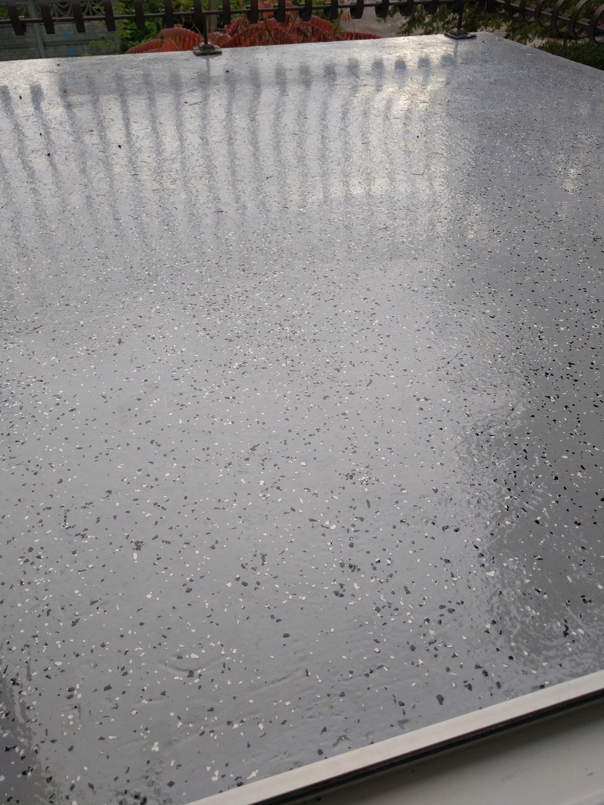 - Затем на высохший пол нанести бесцветную полиуретановую смолу, чтобы закрыть хлопья внутри.