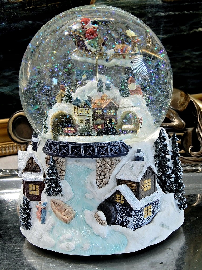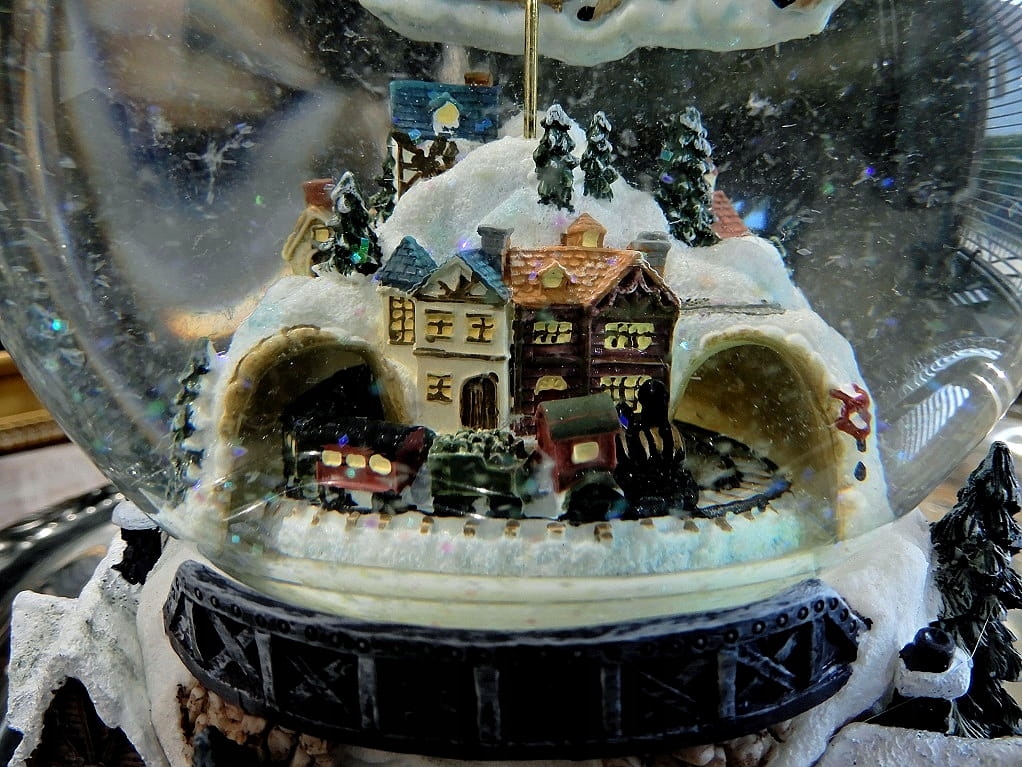 На нем Дед Мороз летает в санях, движущийся поезд, снег, подсвечен. домики у реки и все такое.что создает сказочную атмосферу Рождества.