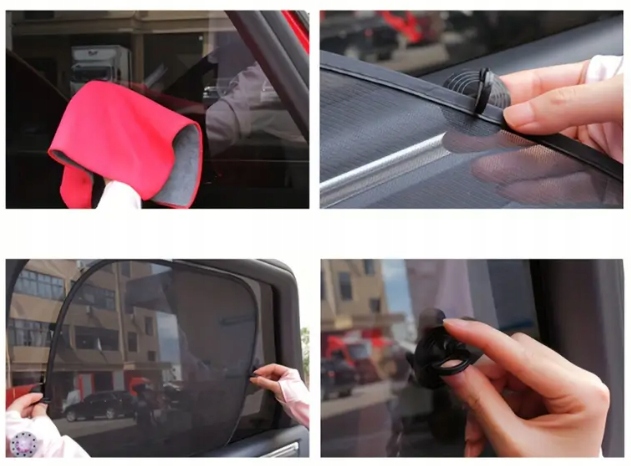 благодаря использованию 4 прочных всасывающих чашек b>, крышки могут быть стабильными на боковых окнах автомобиля. Застежка проста и не требует использования инструментов - просто нанесите крышку к стеклом и нажмите на всасывающую чашку. При необходимости их можно легко удалить и снова установить в другом месте.