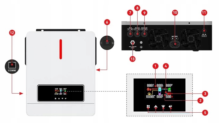 Комплексная конструкция экрана и индикаторы цвета динамически отображают системы системы и состояние инвертора. Солнечные панели