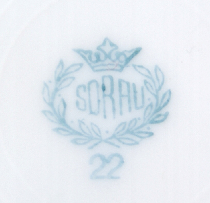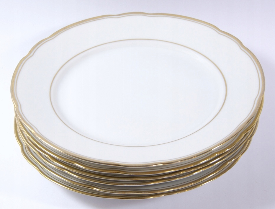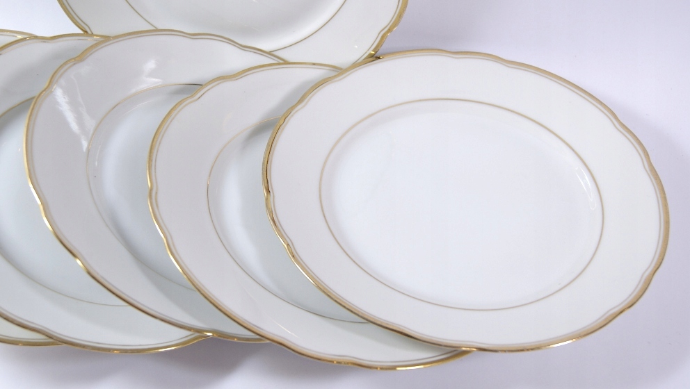 Объект аукциона представляет собой красивый старый набор из 6 десертных тарелок, изготовленных из белого фарфора, украшенного позолочкой.