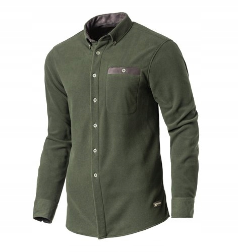 Мужская рубашка темного цвета из теплого флиса, устойчивого к катышкам, что делает ее нежной и мягкой на ощупь. Воротник застегивается на пуговицы, на левой груди прорезной карман на пуговице. Рубашка имеет декоративную отделку коричневой замшей в верхней части карманов, на внутренней стороне воротника и манжет, что придает рубашке элегантный вид.