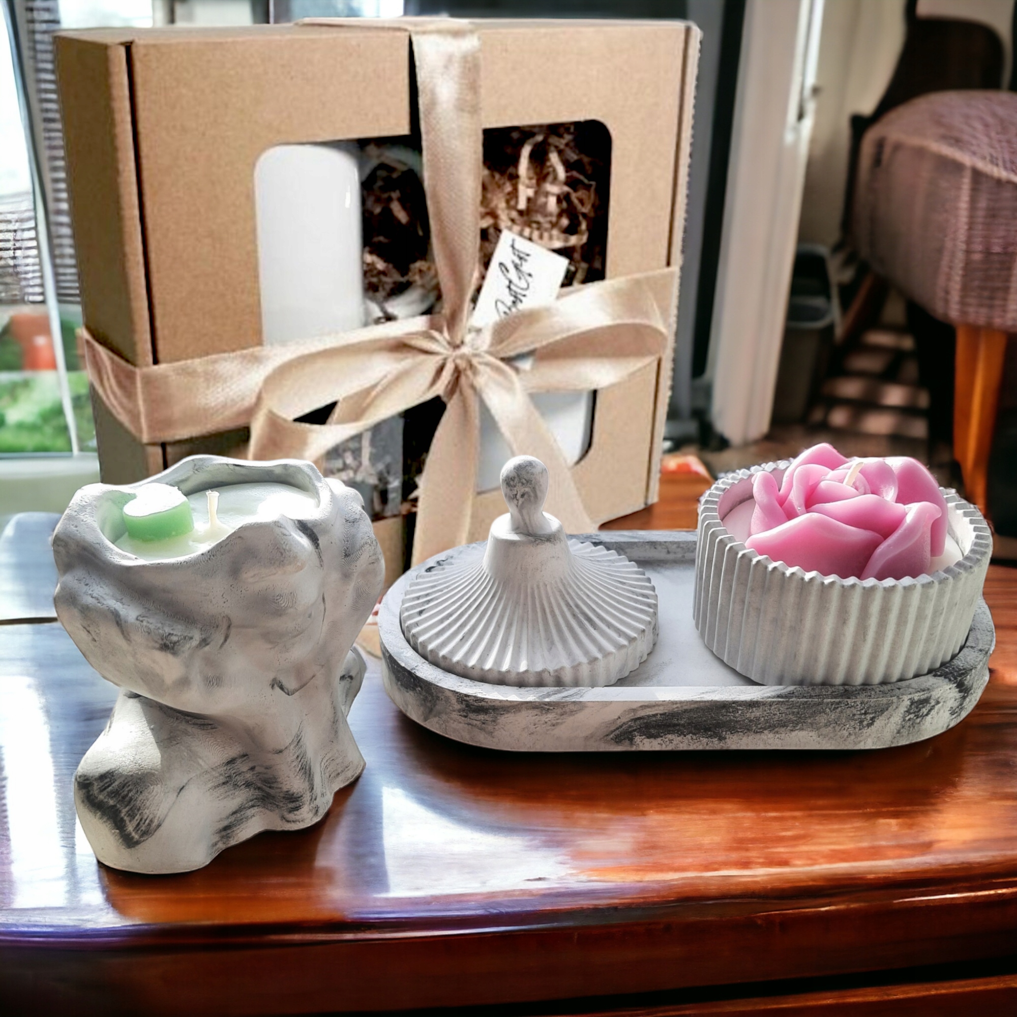 Подарите набор соевых свечей стильно и в подарочной упаковке. Эта элегантная коробка добавит элегантности вашему подарку.
