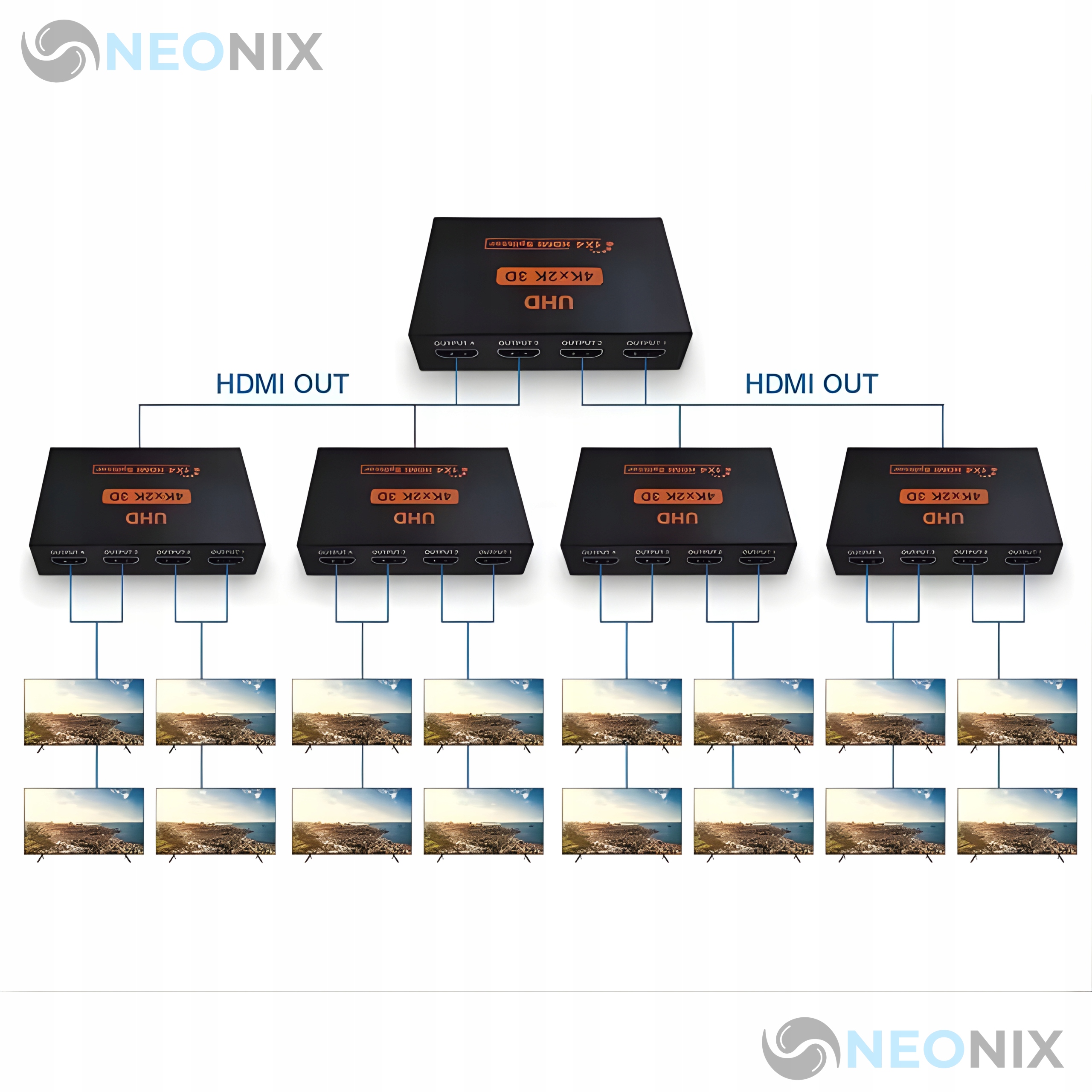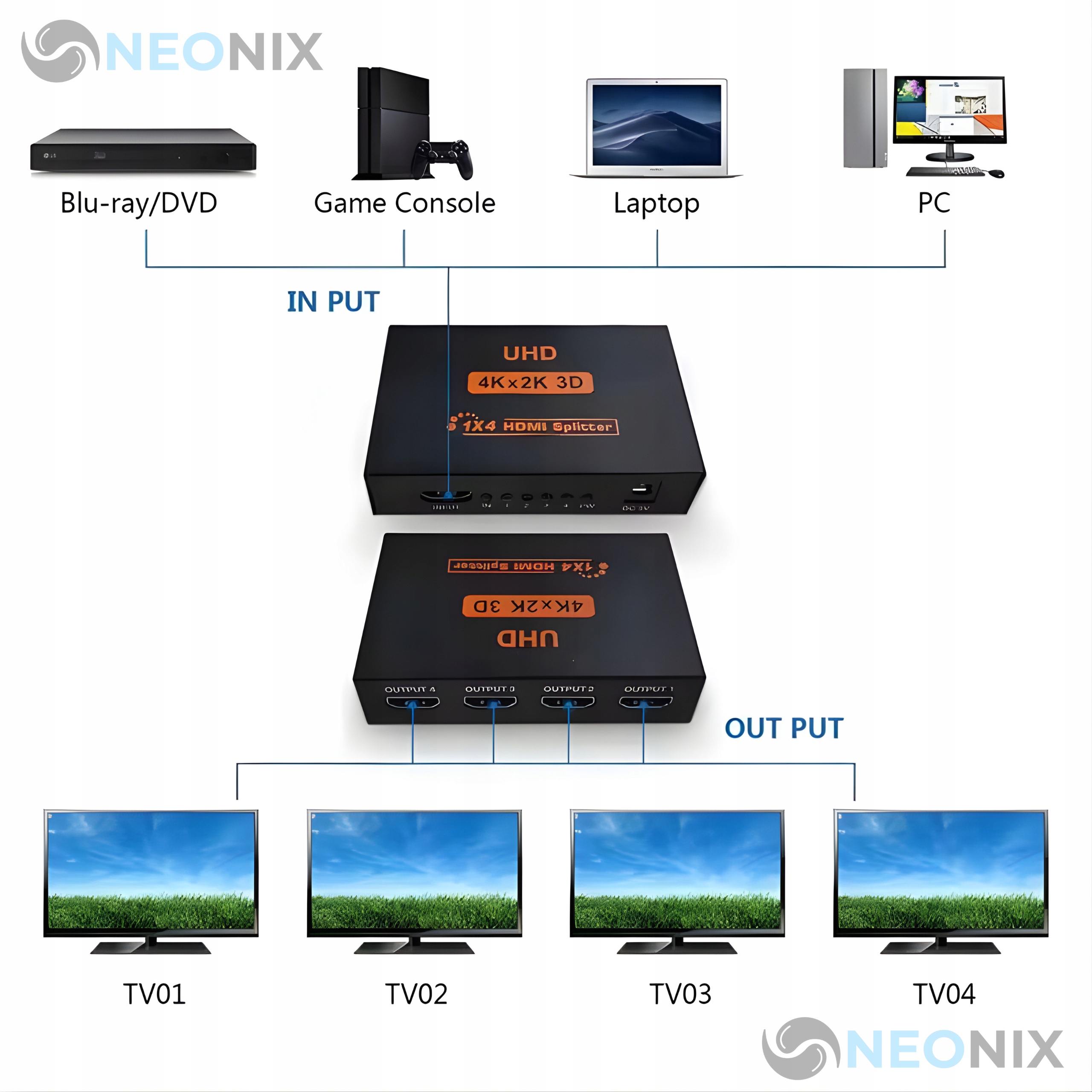 NEONIX HDMI Splitter 1x4 4K UHD 3D — один сигнал, четыре экрана. Идеальное изображение без компромиссов!