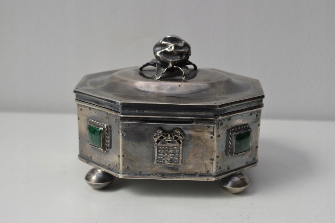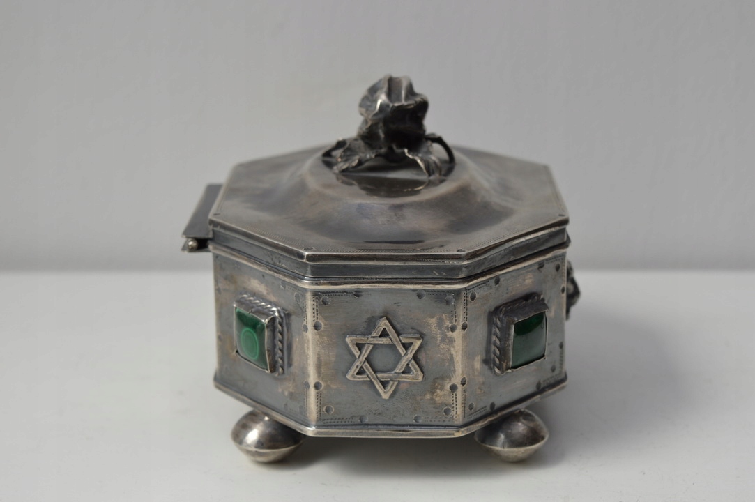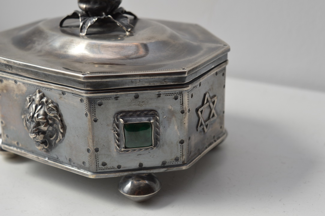 A красивая сахарница коробчатого типа XIX века, поддерживаемая на четырех ножках профилированной крышкой, закрепленной на шарнире. Крышку сахарницы увенчивает лимон - тоже из серебра. Серебро чрезвычайно богато гравировано, внутренняя часть полирована позолотой. По бокам сахарницы имеются многочисленные иудейские украшения и драгоценные камни.