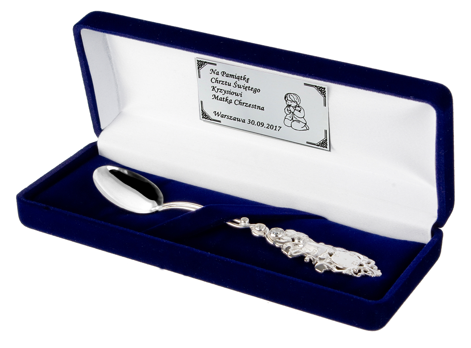 Серебряная чайная ложка - идеальный подарок для крещения или родов как для мальчика, так и для девочки. Сделано полностью из серебра в выборке 925 (у него есть проверка института в Варшаве). Четыре страза Сваровского элемента встроены в ложку. гравирующие данные на чайной ложке и посвящении на коробке, которую мы делаем бесплатно.