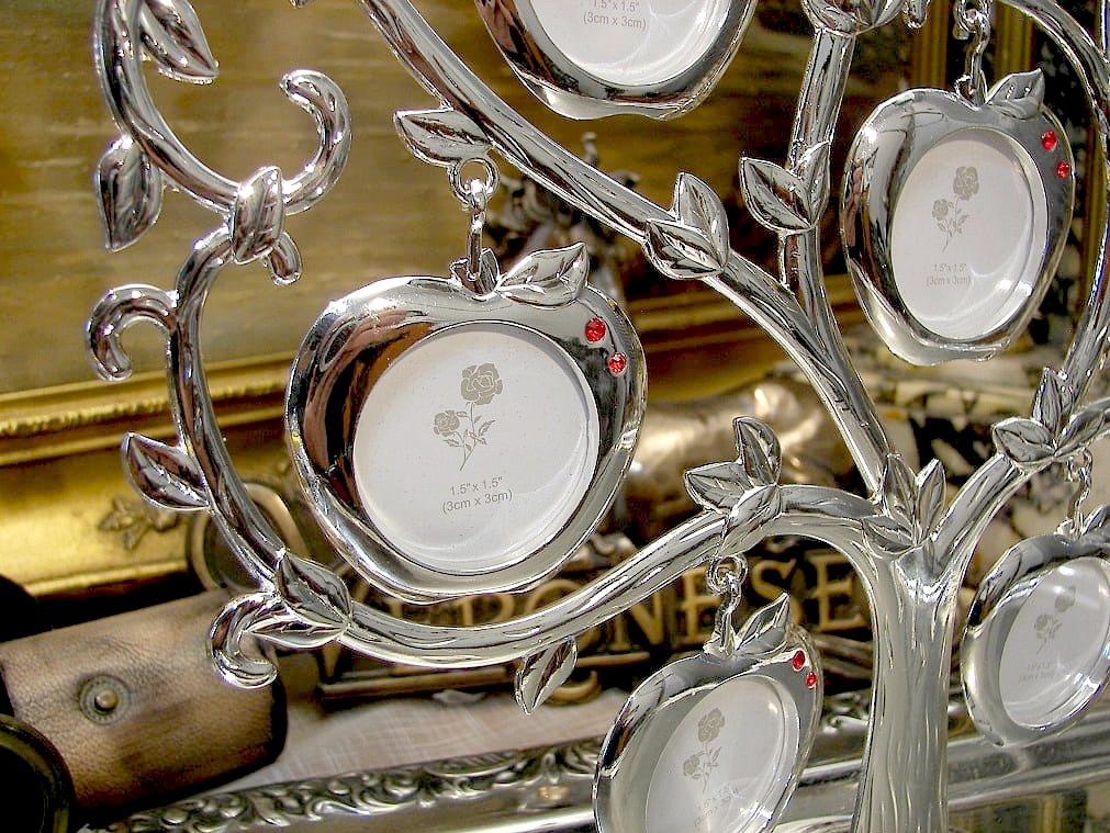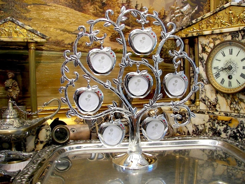 Приглашаю вас приобрести красивое «дерево счастья», на котором вы сможете кратко изложить свою родословную на 7 подвесках в виде имитации яблок и рубинов. Изделие изготовлено из цинкового сплава, покрыто серебром, рамки подвешены на декорированную раму с изображением яблони. Все это чудесно сверкает при любом освещении. К сожалению, фотографии не передают красоты изделия. Рамки для фотографий односторонние. Предмет выглядит фантастически. Отличный сувенир, подарок на многие случаи жизни: от дня рождения до свадьбы