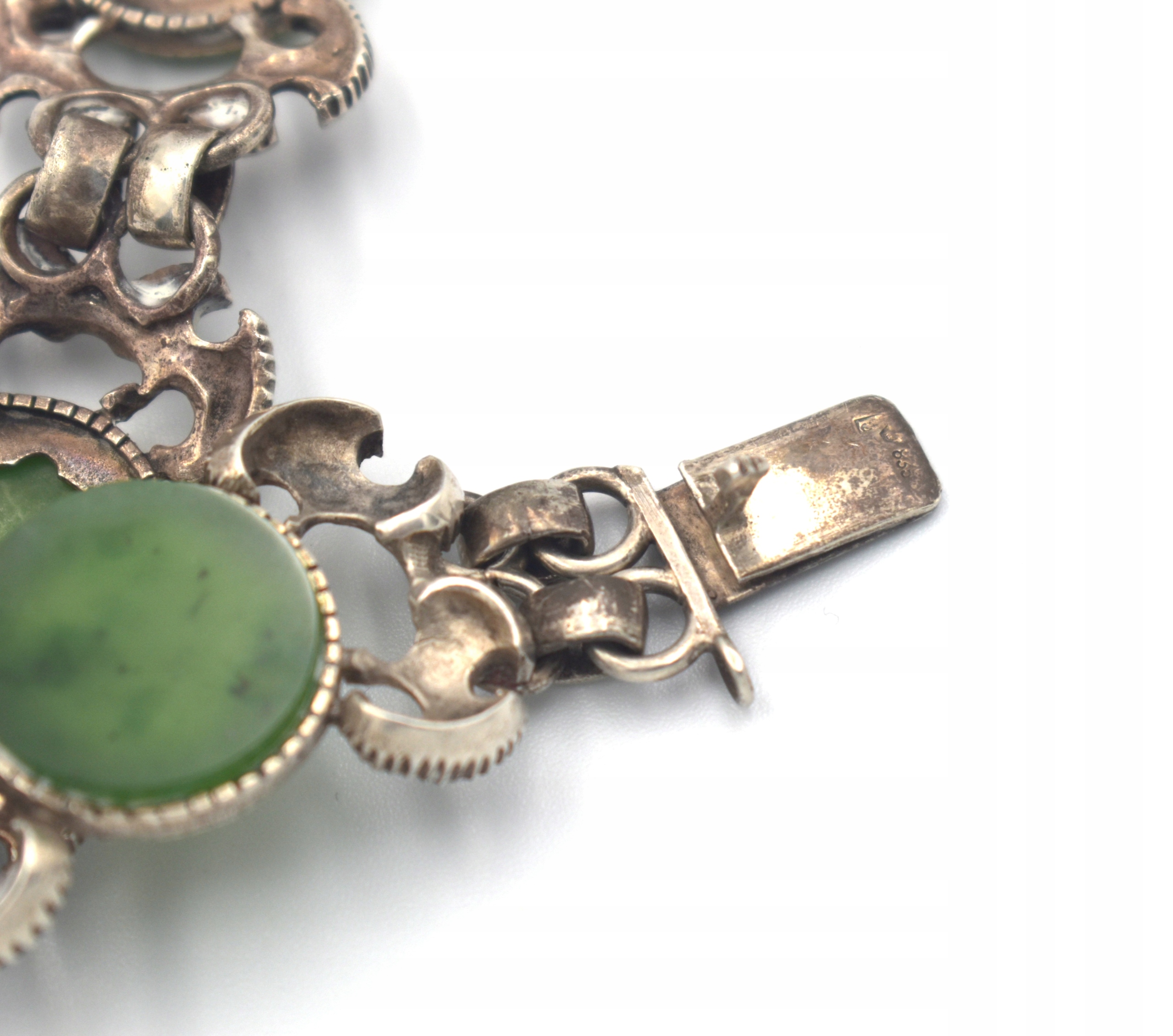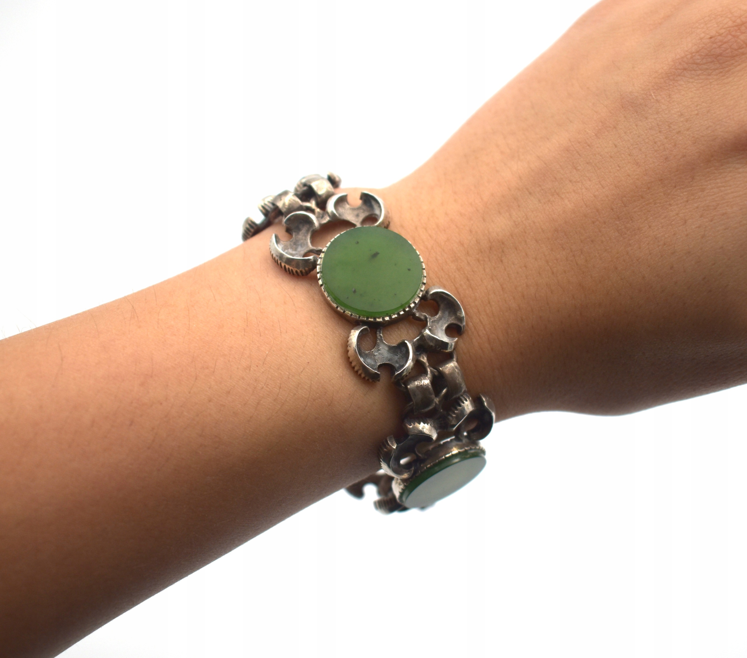 великолепный серебряный браслет, украшенный зелеными круглыми нефритами.