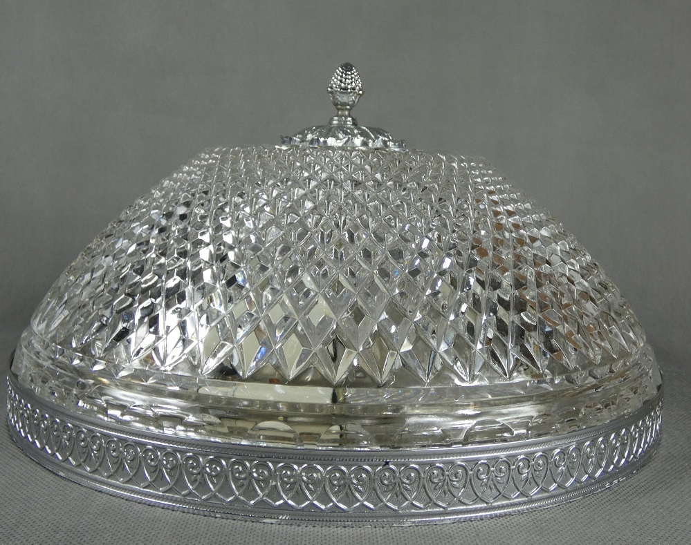 Цветной металлический обод серебристого цвета, хрустальный абажур.