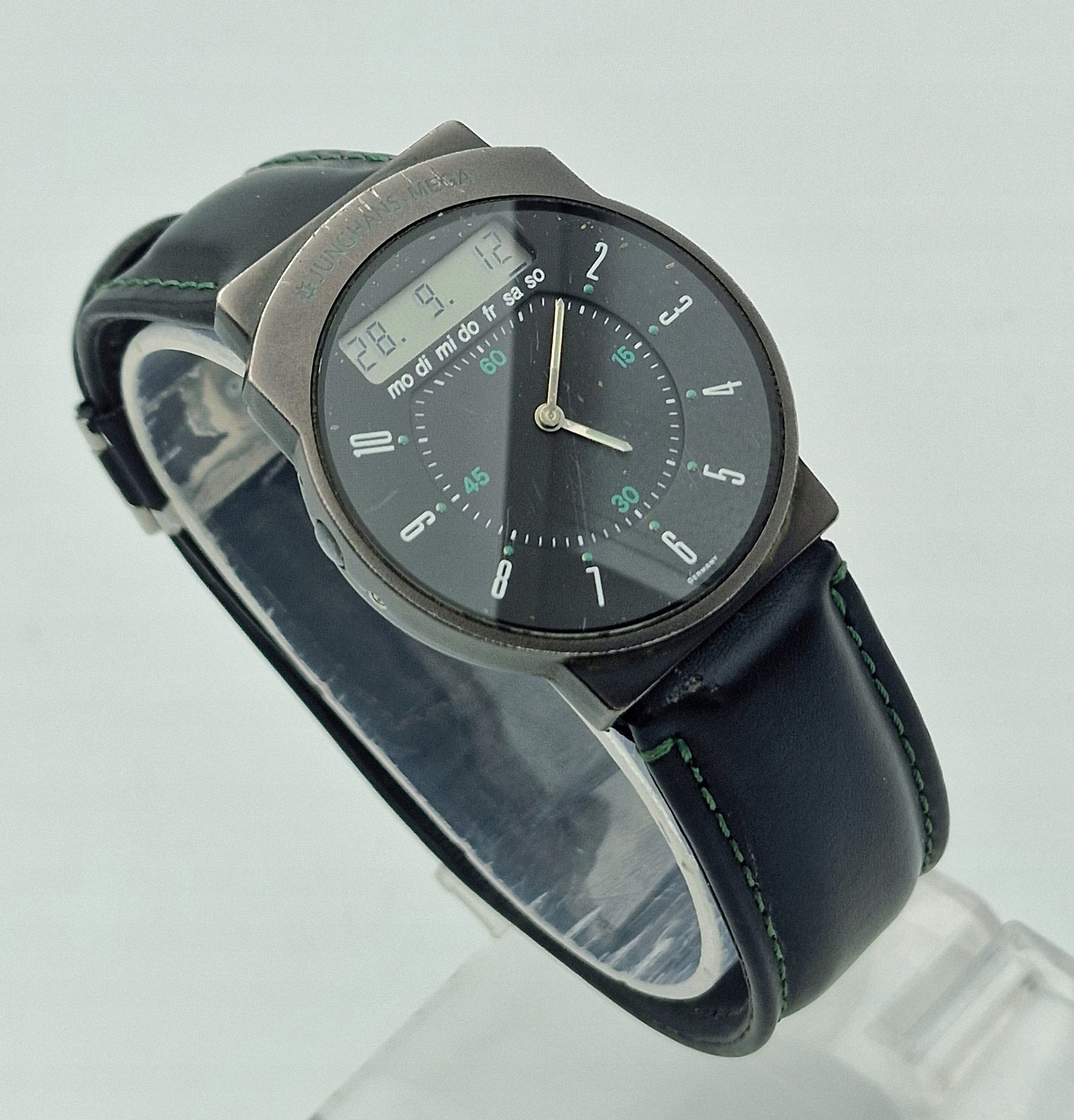 - Блэк-металлический диск с дисплеем в двенадцать часов. Оригинальный щит, подписанный: « Junghans, Mega, Германия ». Щит в идеальном состоянии, показанном на картинках.