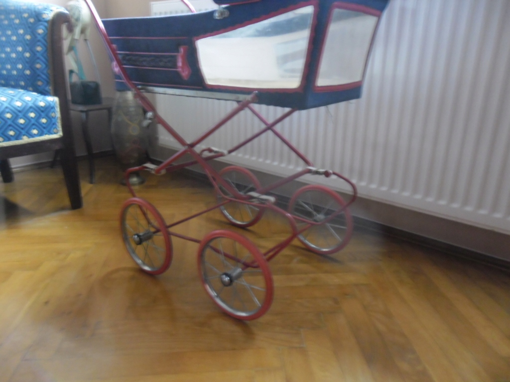 СТАРАЯ КОЛЯСКА ДЛЯ КУКЛ ПАНОРАМЫ, СИНЯЯ И КРАСНАЯ