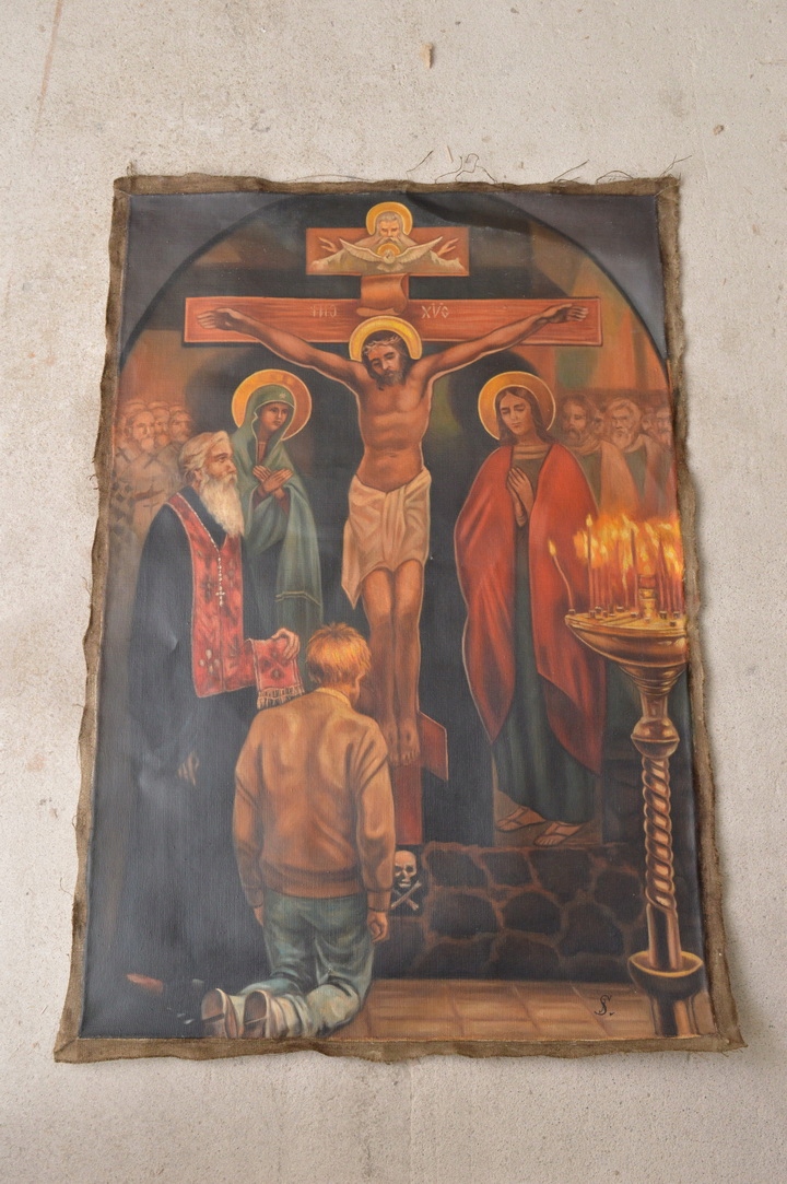Рама и подрамник развалились от старости около 20 лет назад и до сих пор не оформлены. Холст был отремонтирован в этот период.