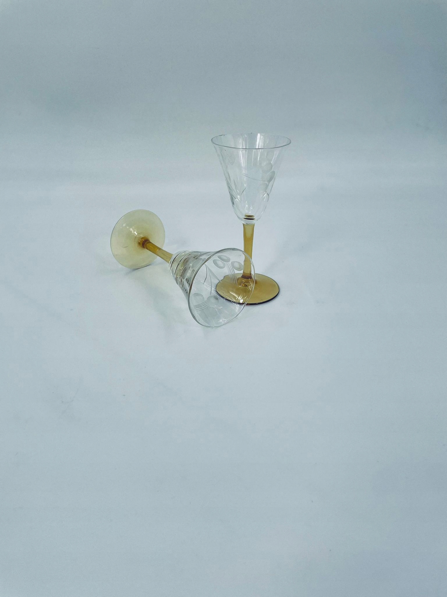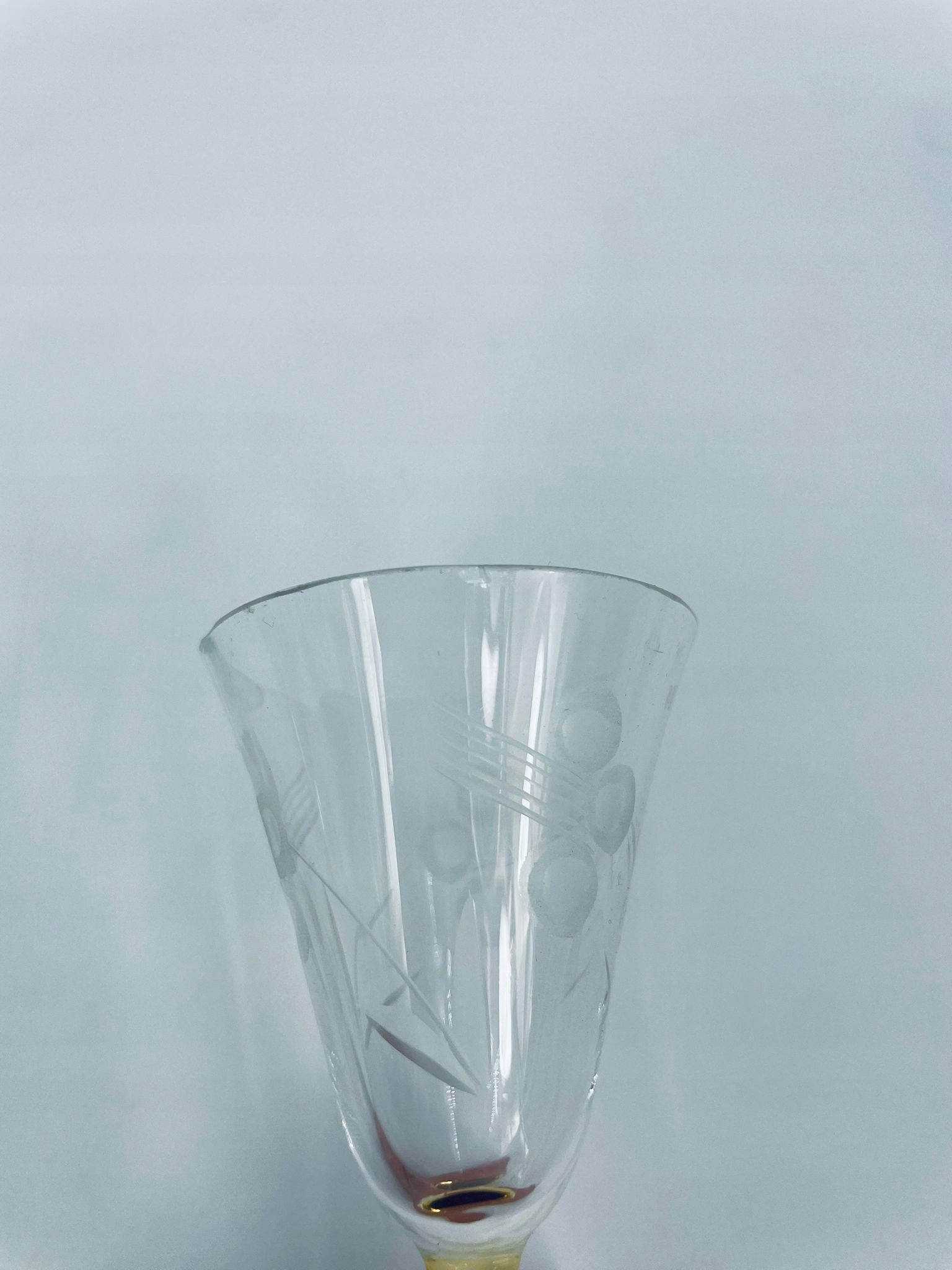 винтажное стекло водки, изготовленное из хрустального стекла. Чашка характеризуется определенным рисунком и слегка волнистым краем, ногой и основой янтарного цвета. У одного стекла есть небольшой повреждение ранома.