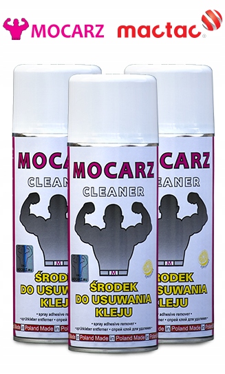 - Mocarz - спрей для удаления клея после нанесения автомобильной пленки, рекламной пленки, упаковочной ленты, наклеек, этикеток. Он также удаляет асфальт, смолу и другие липкие и нефтяные вещества.