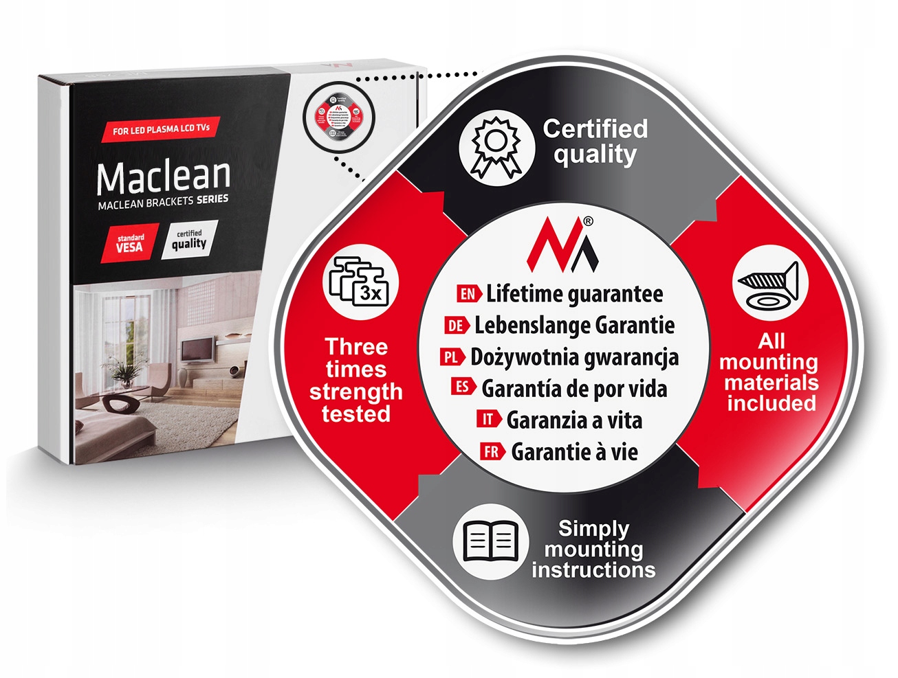 Maclean предлагает широкий ассортимент профессиональных креплений для светодиодных/ЖК-телевизоров, счетчиков и многих аксессуаров RTV и электронных продуктов.