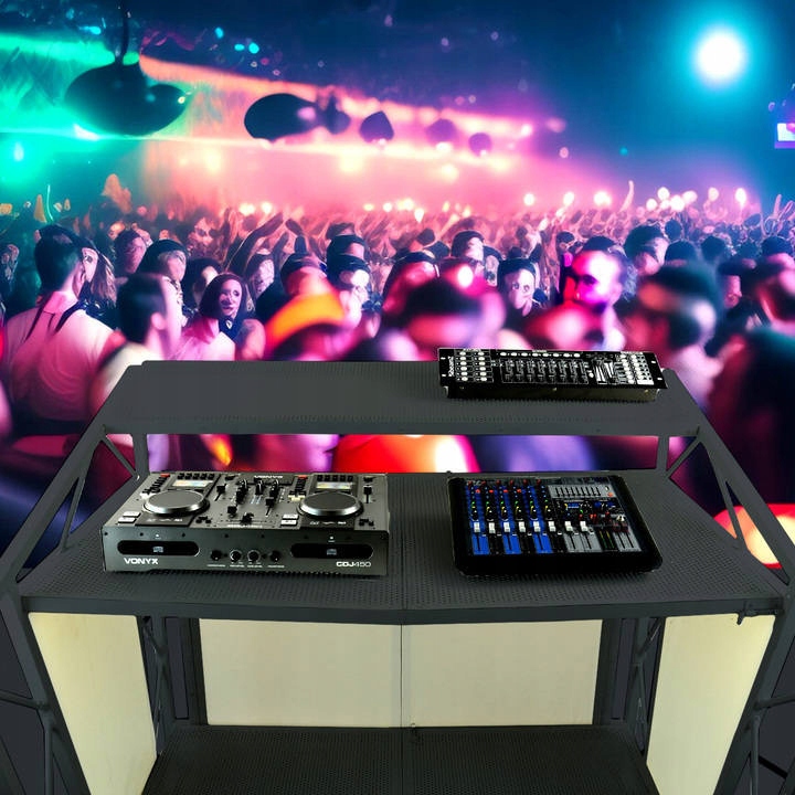 Он обеспечит вам не только функциональность, но и элегантность. Эта мобильная стойка — идеальное решение как для путешествующих диджеев, так и для музыкальных клубов. Полностью складная очень большая диджейская будка для установки диджейского оборудования. Диджейская кабина XL имеет встроенный тройной стол с идеальной рабочей высотой 88 см (основная средняя столешница), нижнюю столешницу на высоте 20 см (например, для усилителя) и верхнюю, более узкую столешницу на высоте 100 см ( например, для контроллера DMX). Вся система состоит из складных панелей, что упрощает сборку и разборку и занимает мало времени. Это экономит время на другие важные для выступления дела и приготовления.