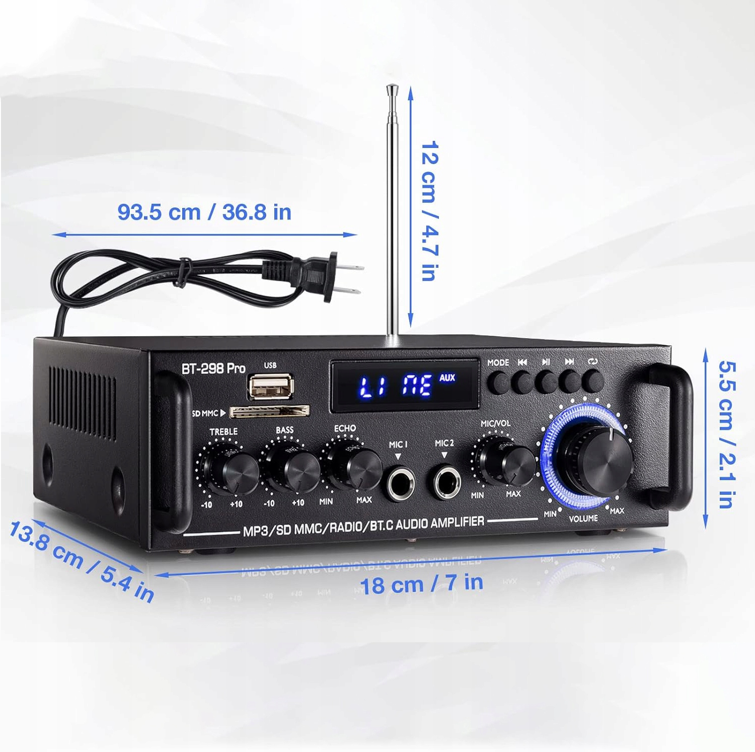 домашний аудио -усилитель с входным сокетом микрофона, вы можете петь караоке с семьей или друзьями дома, усилитель с эхо -функцией, вы получите более совершенный качественный звук Hifi. Кроме того, аудио усилитель с функцией FM в режиме FM позволяет установить более 20 станций.