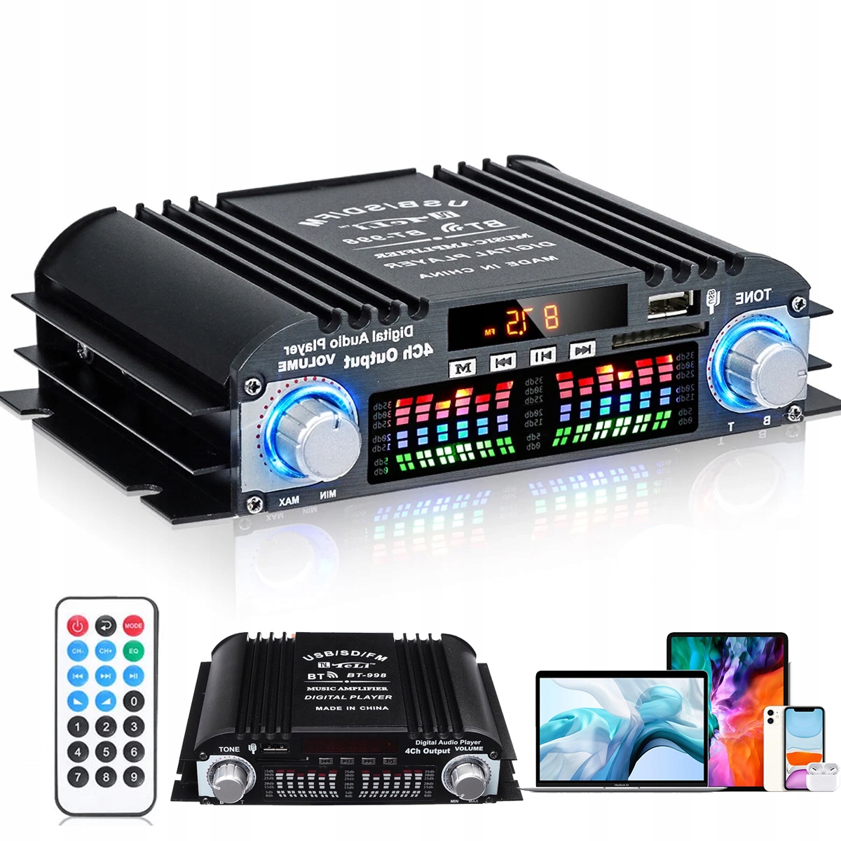 - Усилитель предлагает дополнительные функции, которые расширяют возможности прослушивания, например. регулятор громкости и регулировка низких и высоких частот. В целом, этот усилитель с TF-картой, FM-радио, функцией USB и 4-канальным подключением Bluetooth представляет собой комплексное аудиорешение, предоставляющее вам множество возможностей наслаждаться любимой музыкой.