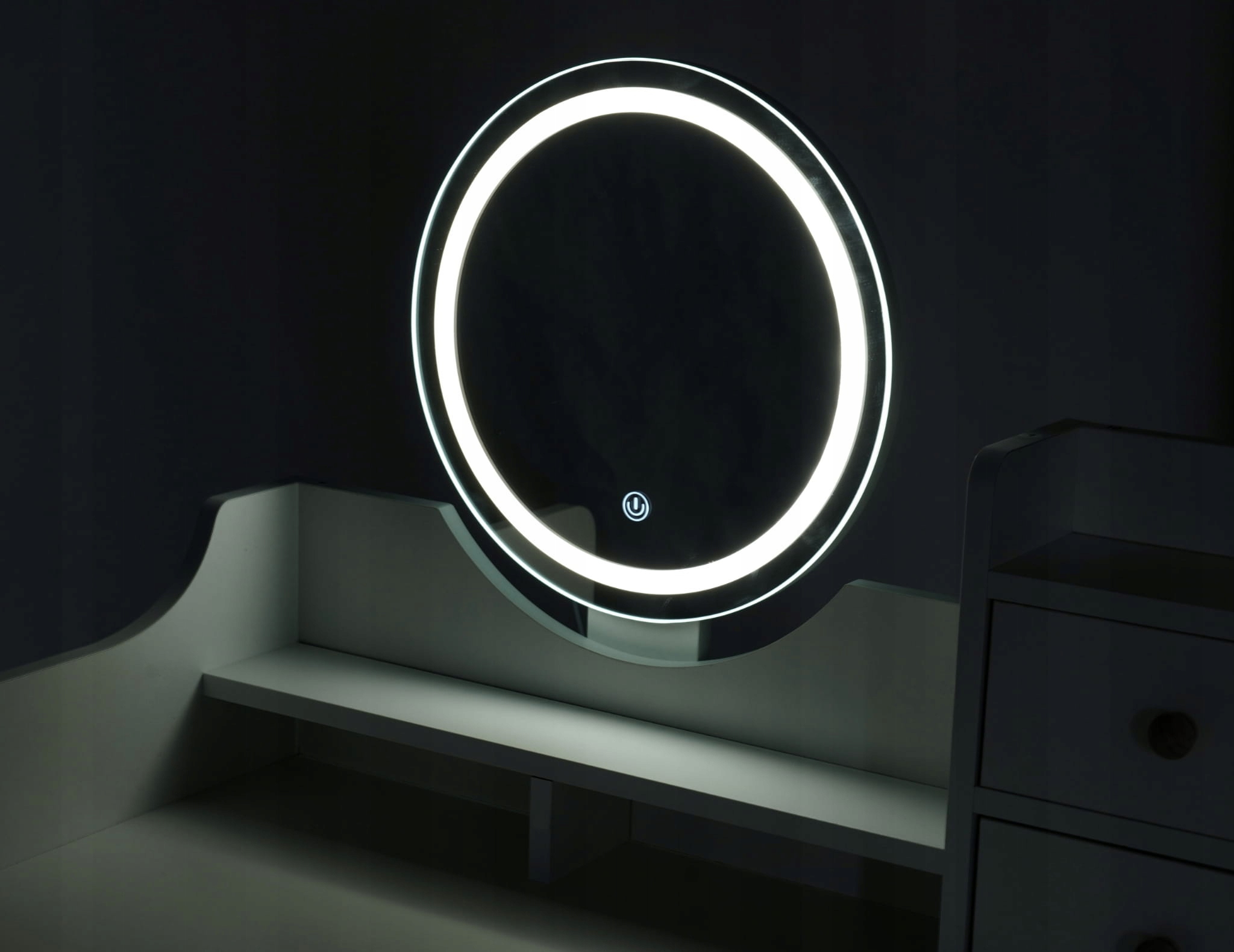 - Зеркало, позволяющее тщательно рассмотреть свой макияж и прическу со всех сторон. Зеркало имеет 3 режима подсветки: от холодного света до более нейтрального и теплого цвета.