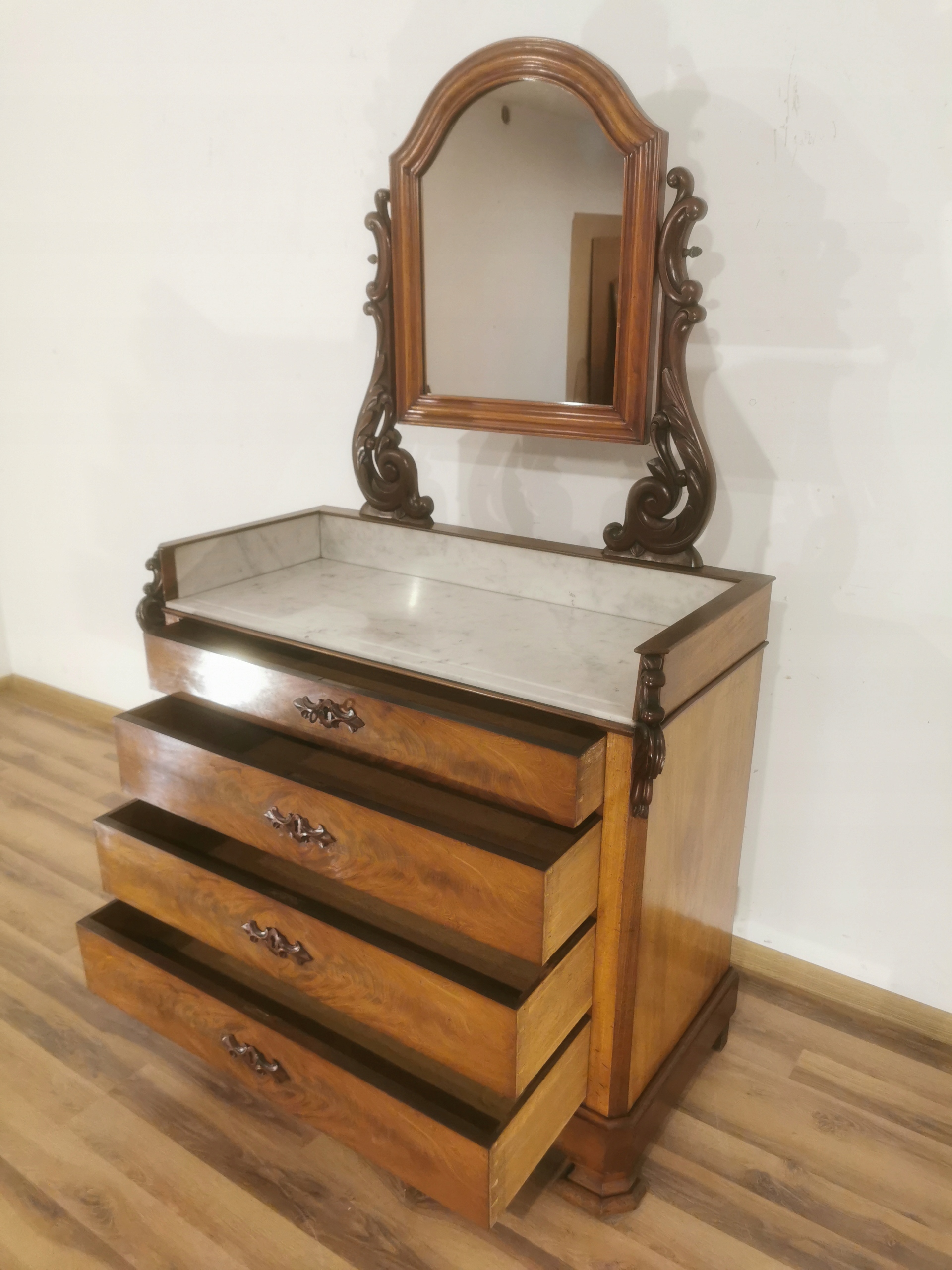Состояние: Для ремонта: незначительные вмятин и повреждение, один винт, держащий зеркало, имеет сильно поврежденную нить, незначительные мраморные чипсы, следы ножа, один ключ, который соответствует ящикам, находится нехватка кружева над рамой зеркала.