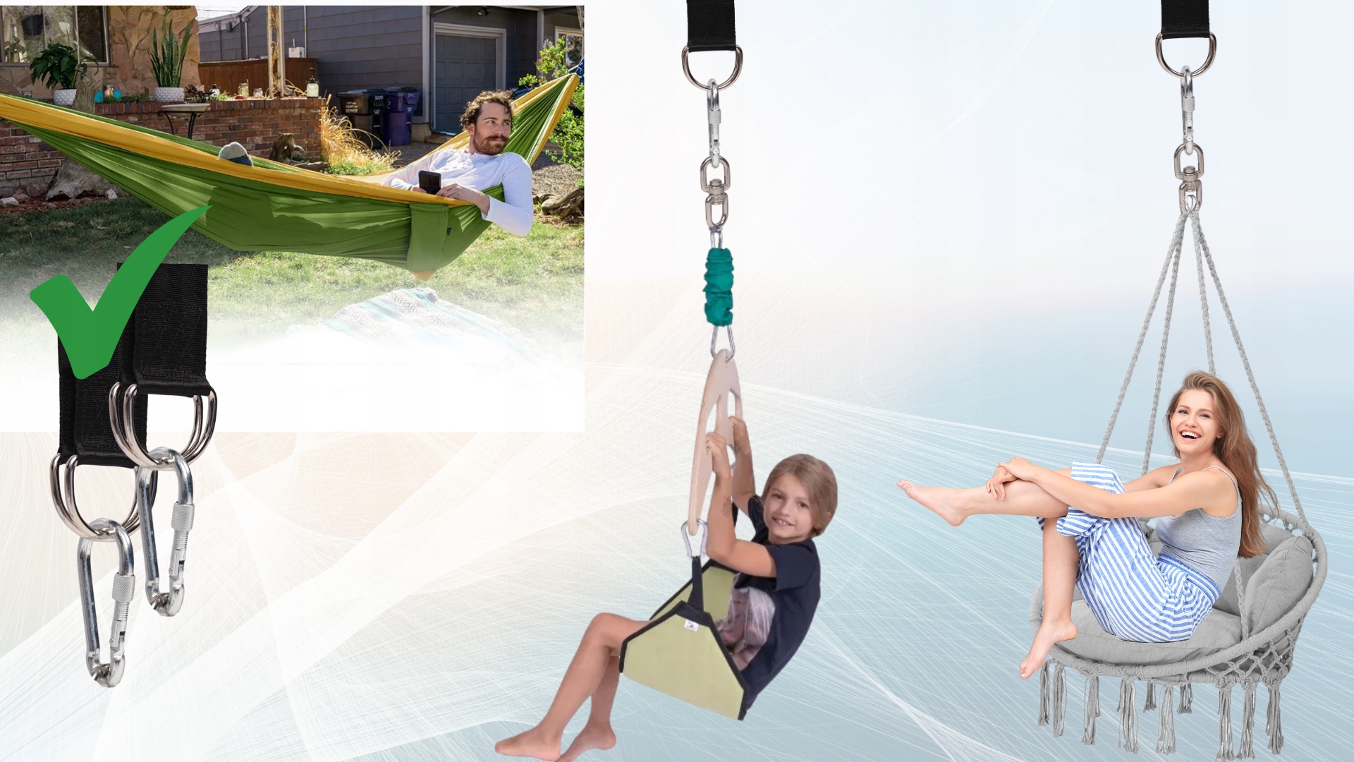 - ✅ приложение для сосования - Универсальность структуры означает, что вы можете использовать представленный набор для крепления гамака, а также для безопасного монтажа качания или подвесного кресла.