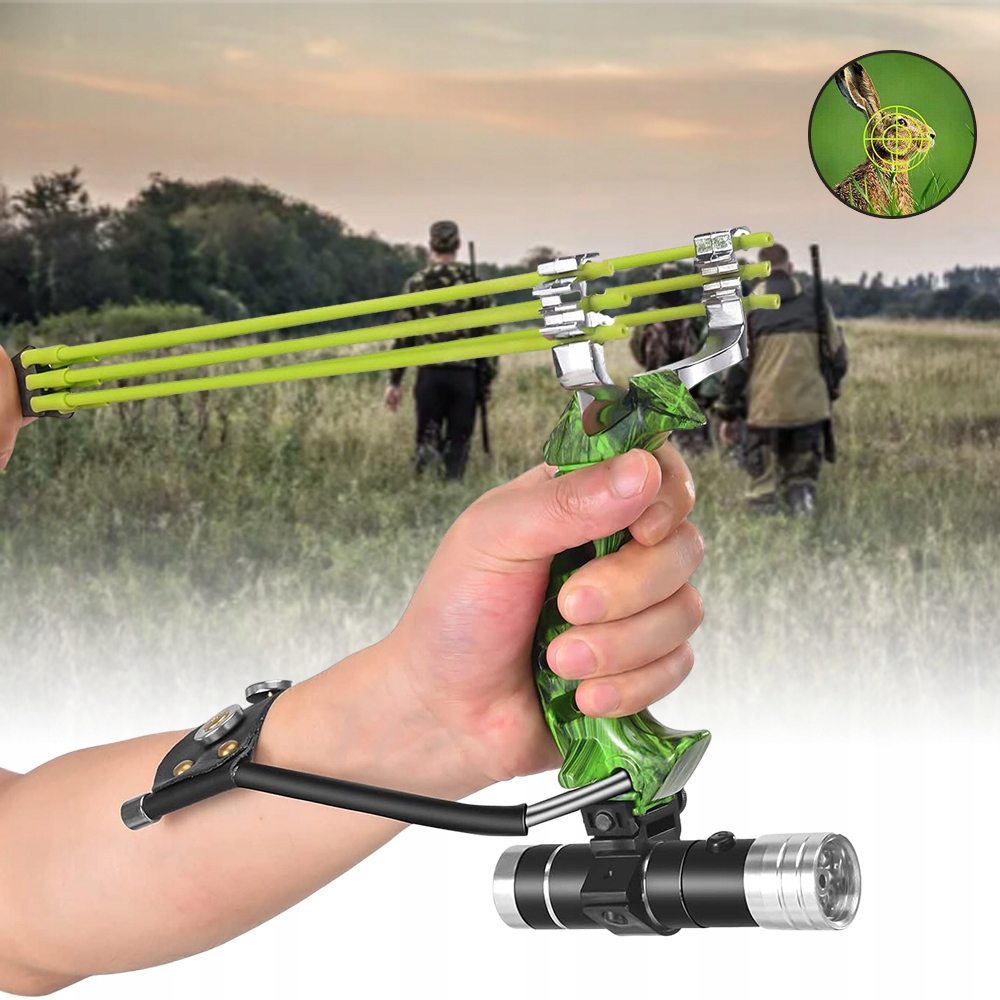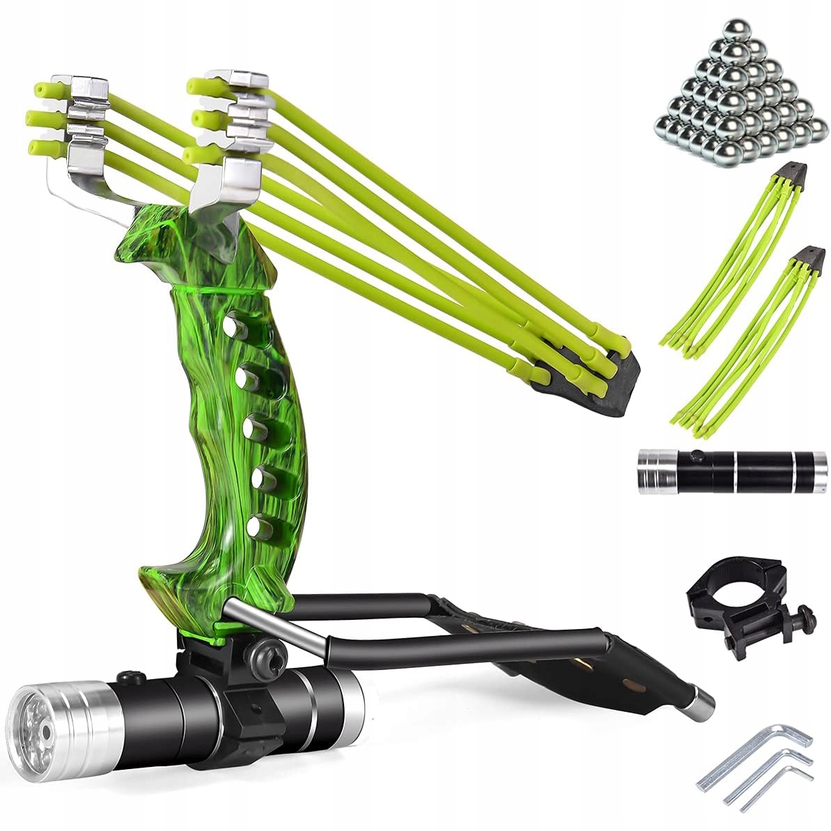 🎁🎁 НАБОР ДЛЯ СТРЕЛЯНИ: Профессиональная рогатка со сменными резиновыми лентами из двух частей, болтовым ключом из трех частей, стальными шариками для боеприпасов из 100 частей и фонариком.