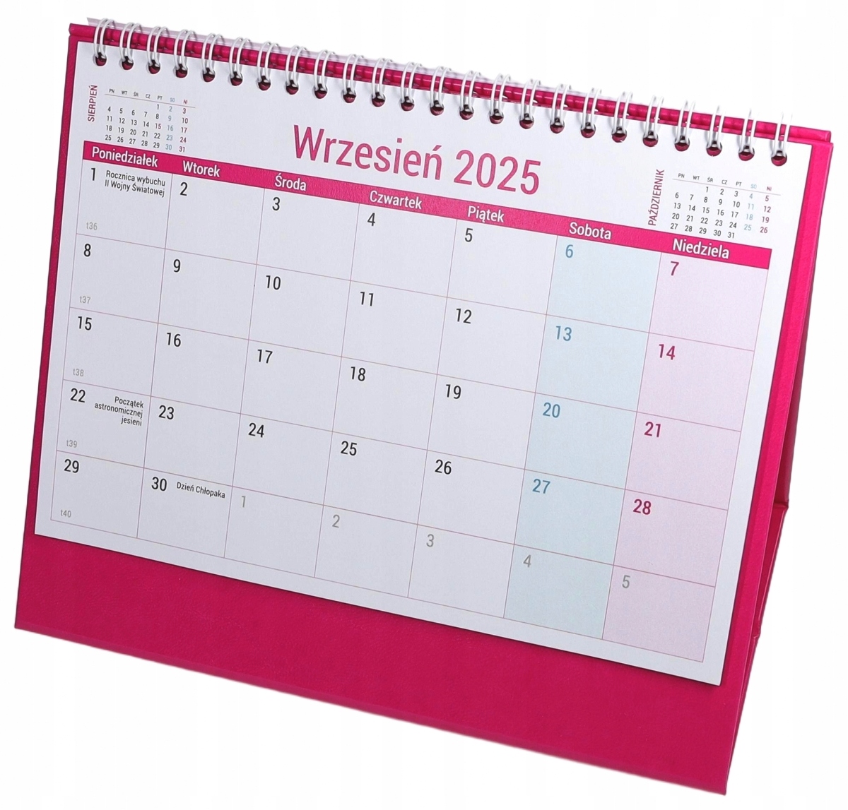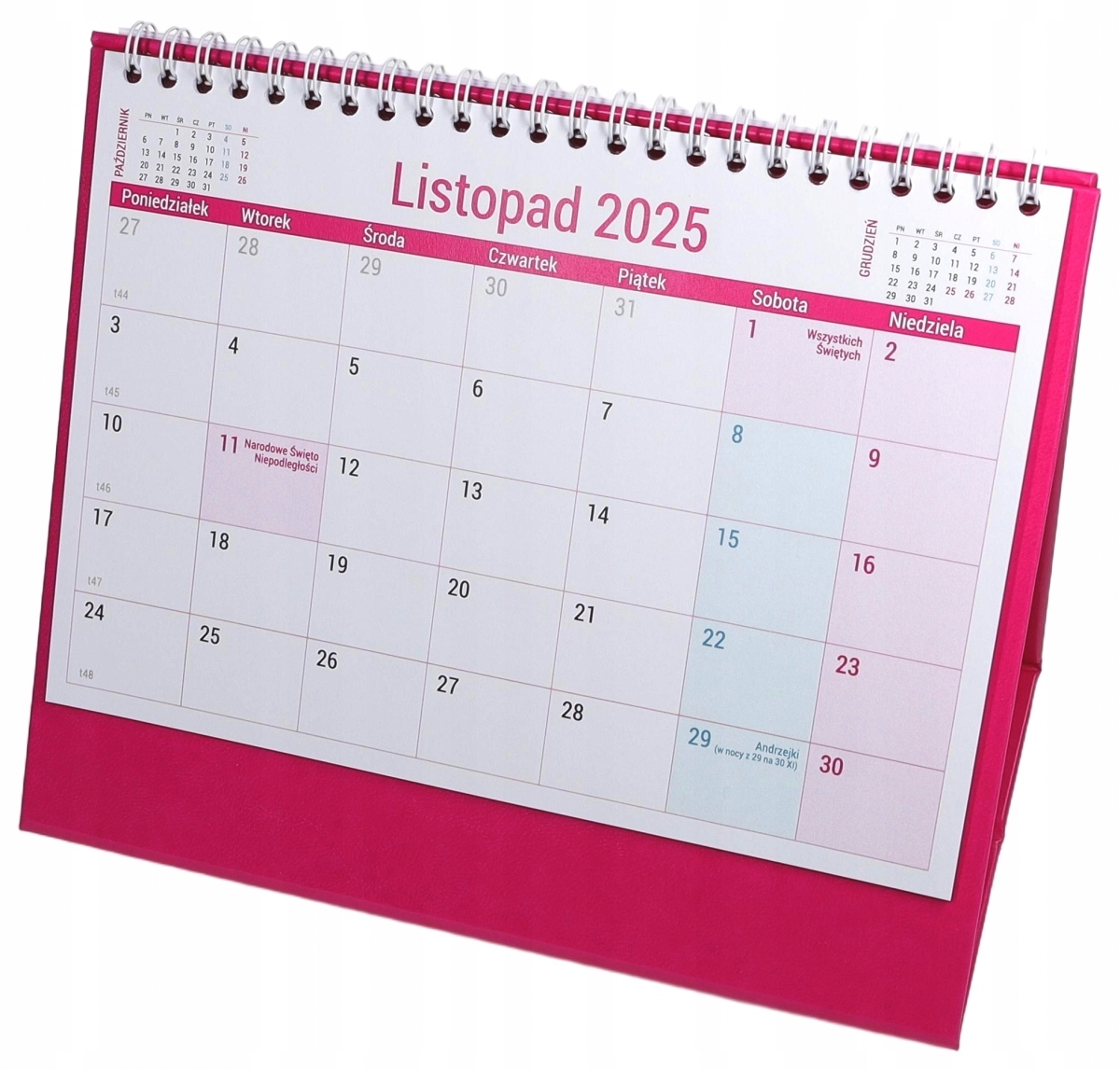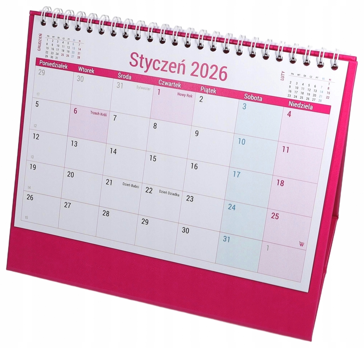 Практический календарь для постановки на столе. Укрепленный стенд в эксклюзивном шпоне обеспечивает долговечность и эстетический вид календаря. Большой прозрачный календарь облегчает планирование и управление сроками. Каждый день есть место, где можно отметить важные события или сделать короткую заметку. У нас есть сокращенный календарь предыдущего и следующего месяца на каждой карте календаря. Календарь отмечен не работающими днями, выбранные обычные и религиозные праздники и коммерческие воскресенья.