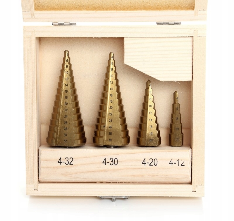 Высокое качество - изготовлено из высококачественной быстрорежущей стали HSS+TYTAN, предназначено для металлов, тонкостенных стальных листов, пластиков.Весь комплект находится в деревянном ящике.