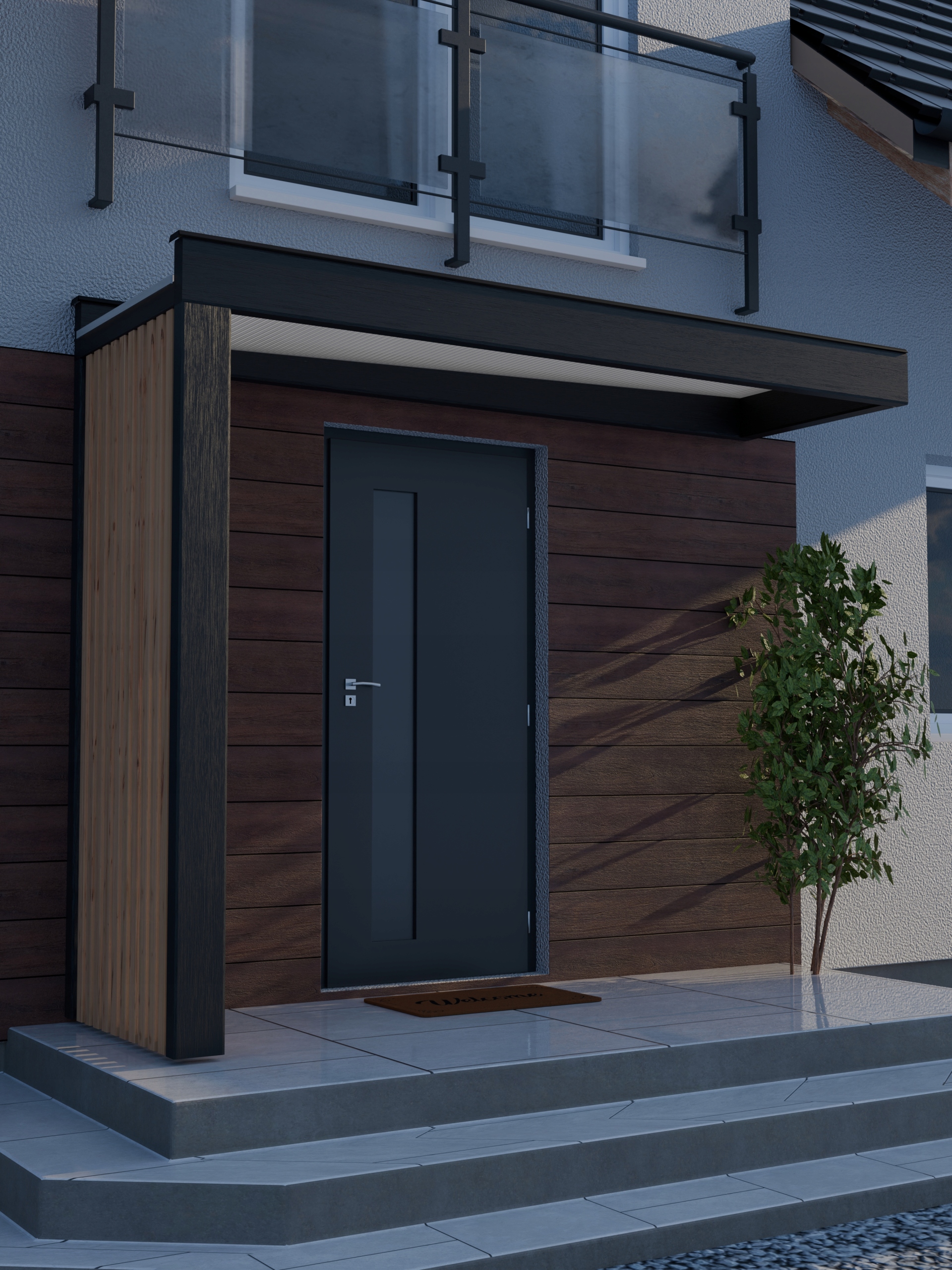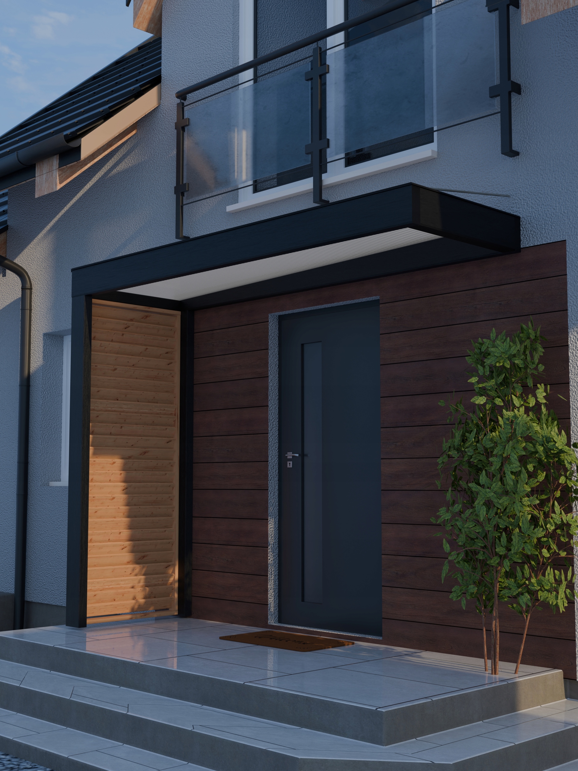 Современная массивная крыша над входной дверью. Благодаря современному дизайну и увеличенному сечению элементов мы добиваемся абсолютной долговечности, безопасности и внешнего вида на долгие годы.