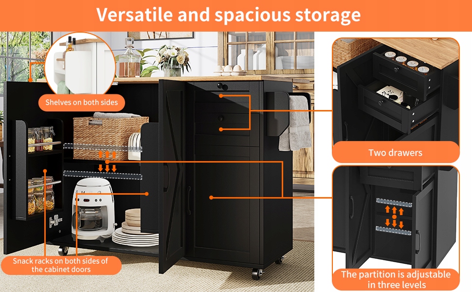 - предлагает много места для хранения с полками с обеих сторон, двумя ящиками и регулируемыми отсеками (три уровня), идеально подходит для организации кухонной утварки, посуды или предметов домашнего обихода.