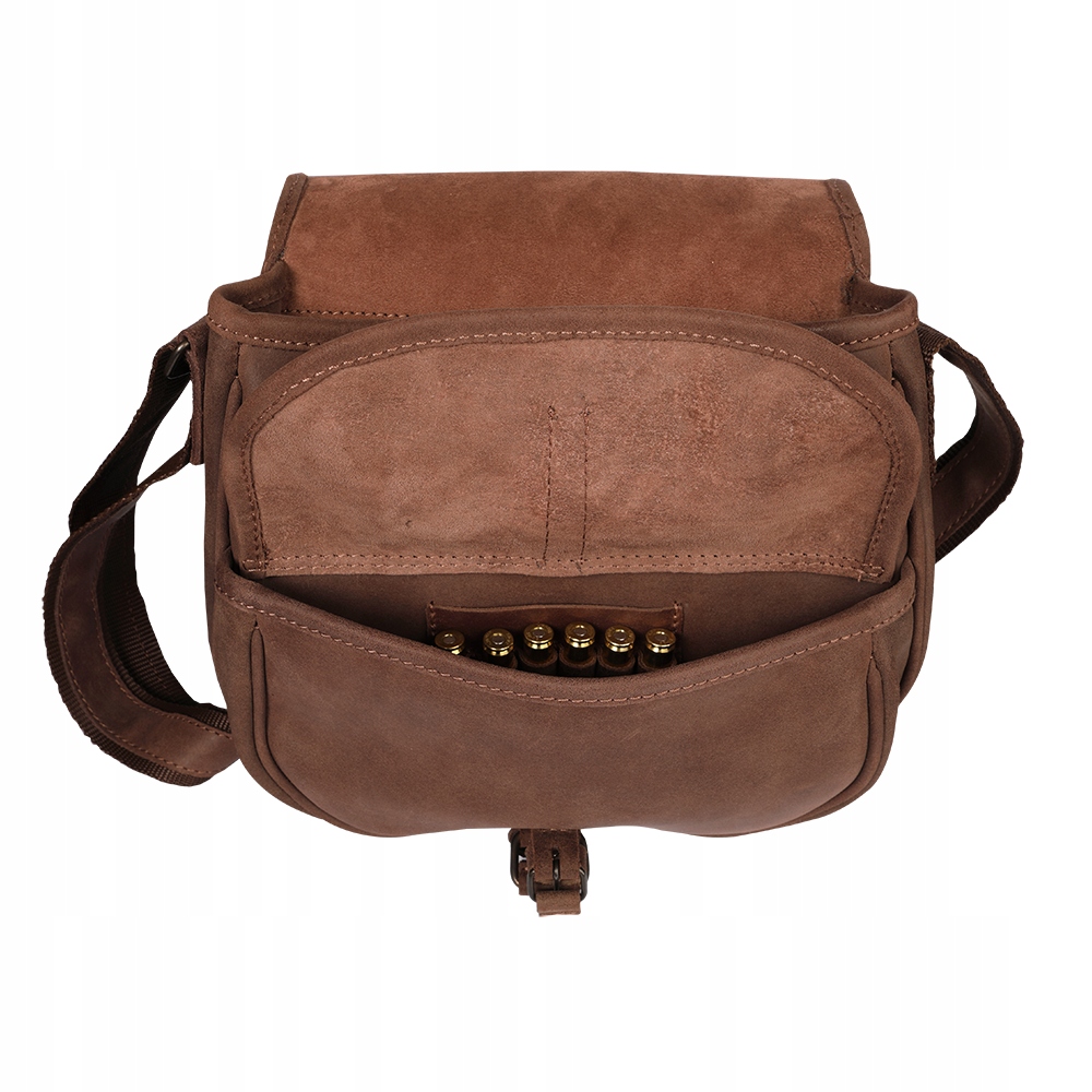 Кожаная охотничья сумка оснащена мягким широким ремнем с регулируемой длиной и отделкой кожей, обеспечивающей удобство использования. Под основным клапаном расположен контейнер для дробовых боеприпасов вместимостью 6 штук, вместительный основной карман и дополнительный карман меньшего размера с местом для 4 шариковых боеприпаса . Все это отделано изящной кожаной отделкой с прочными швами.