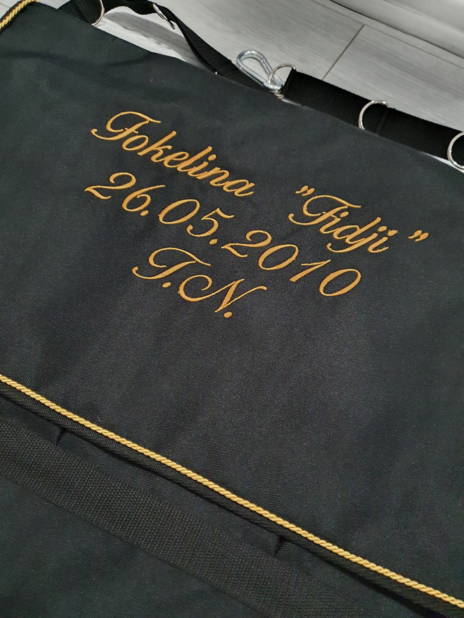 Верхний клапан имеет вышивку с любой надписью, например, именем всадника, именем лошади или названием клуба.