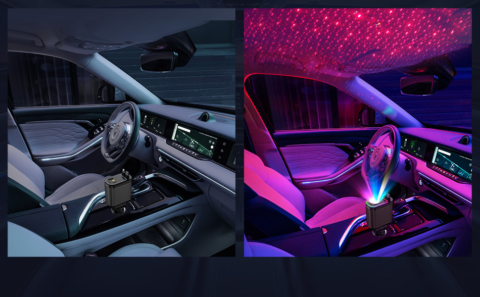 с наступлением ночи огни танцуют в ритме музыки. Будь то романтическое свидание, встреча с друзьями или семейное путешествие, вы сможете создать эксклюзивную атмосферу всего в один клик. Автомобильное зарядное устройство для прикуривателя предлагает два режима освещения с помощью сенсорного переключателя: проекционное освещение звездного неба и красочное настроение